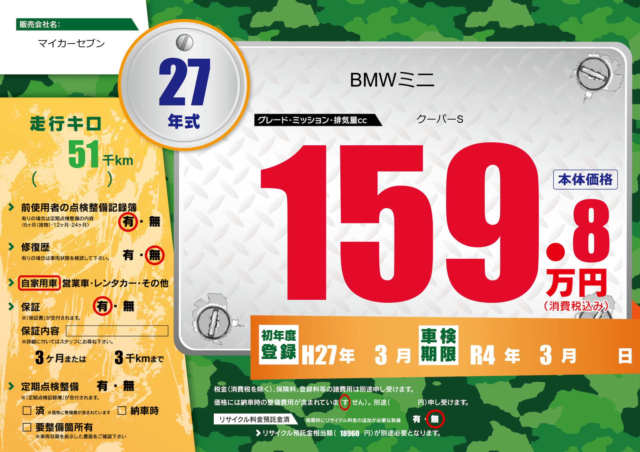| 車名 | BMWミニ | グレード ミッション 排気量 |