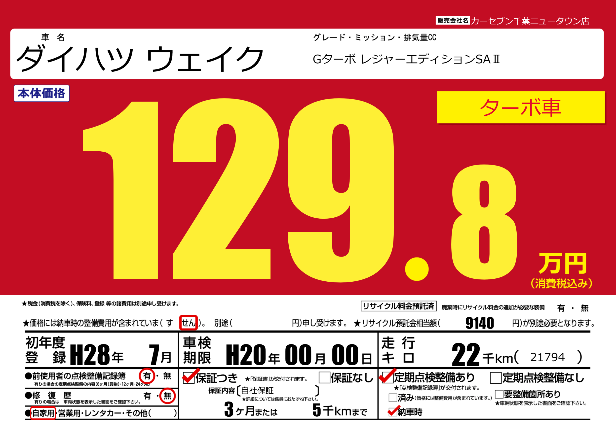 | 車名 | ダイハツ ウェイク | グレード ミッション 排気量 |