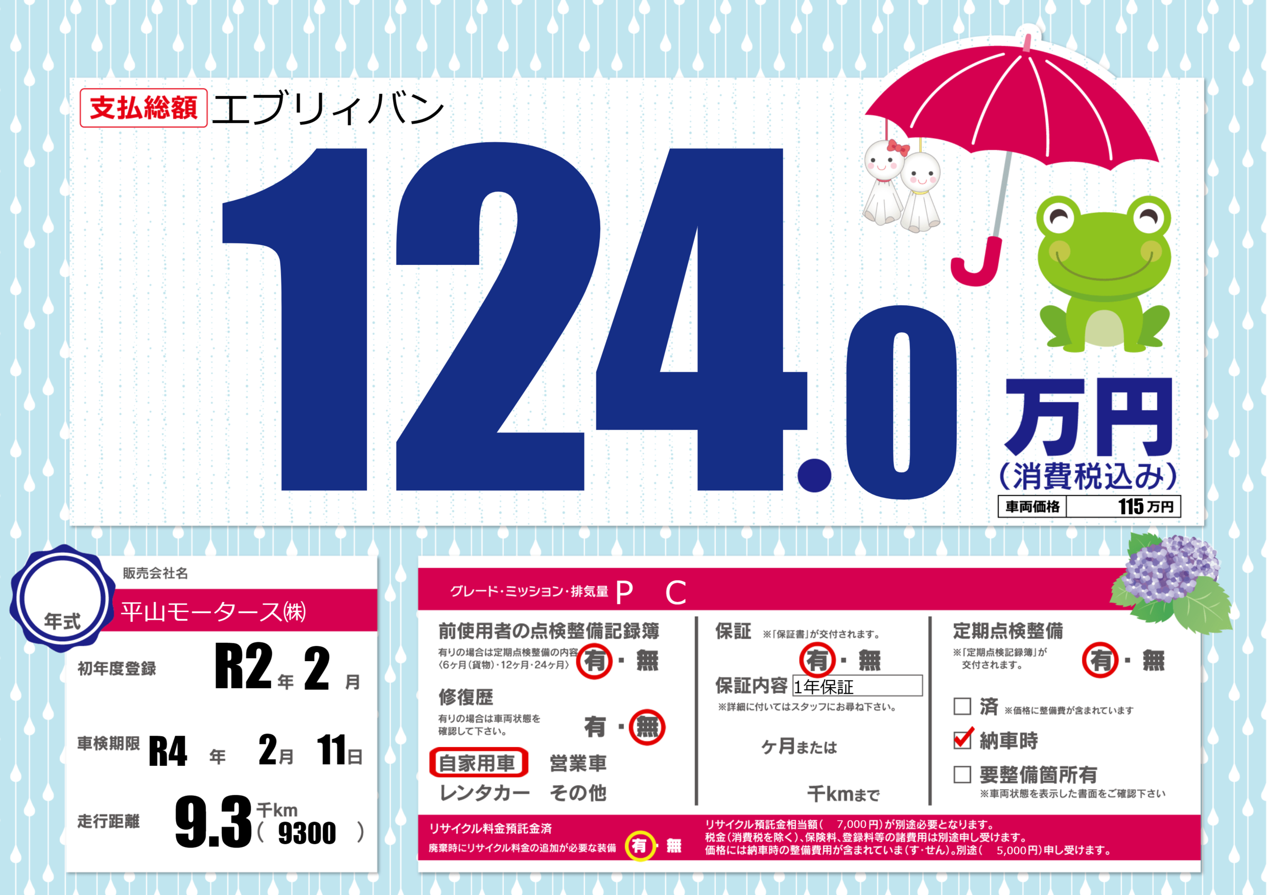 | 定期点検整備 | 定期点検整備あり 納車時あり | ||