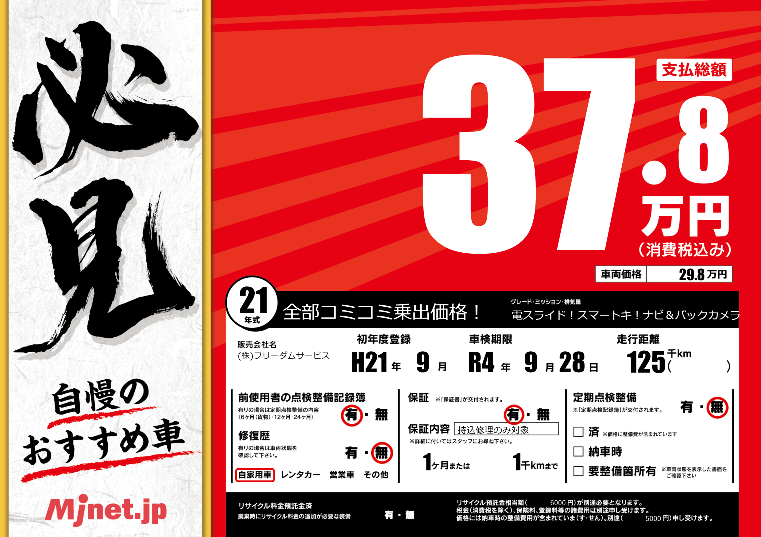 | 走行キロ | 12.5万km | 初年度登録 | H21年9月 |