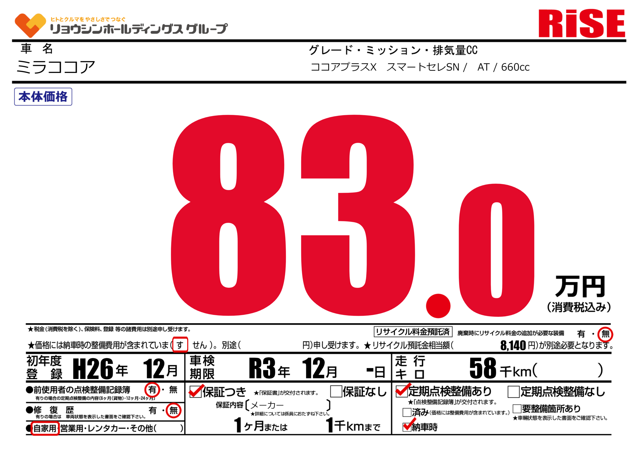 | 走行キロ | 5.8万km | 初年度登録 | H26年12月 |