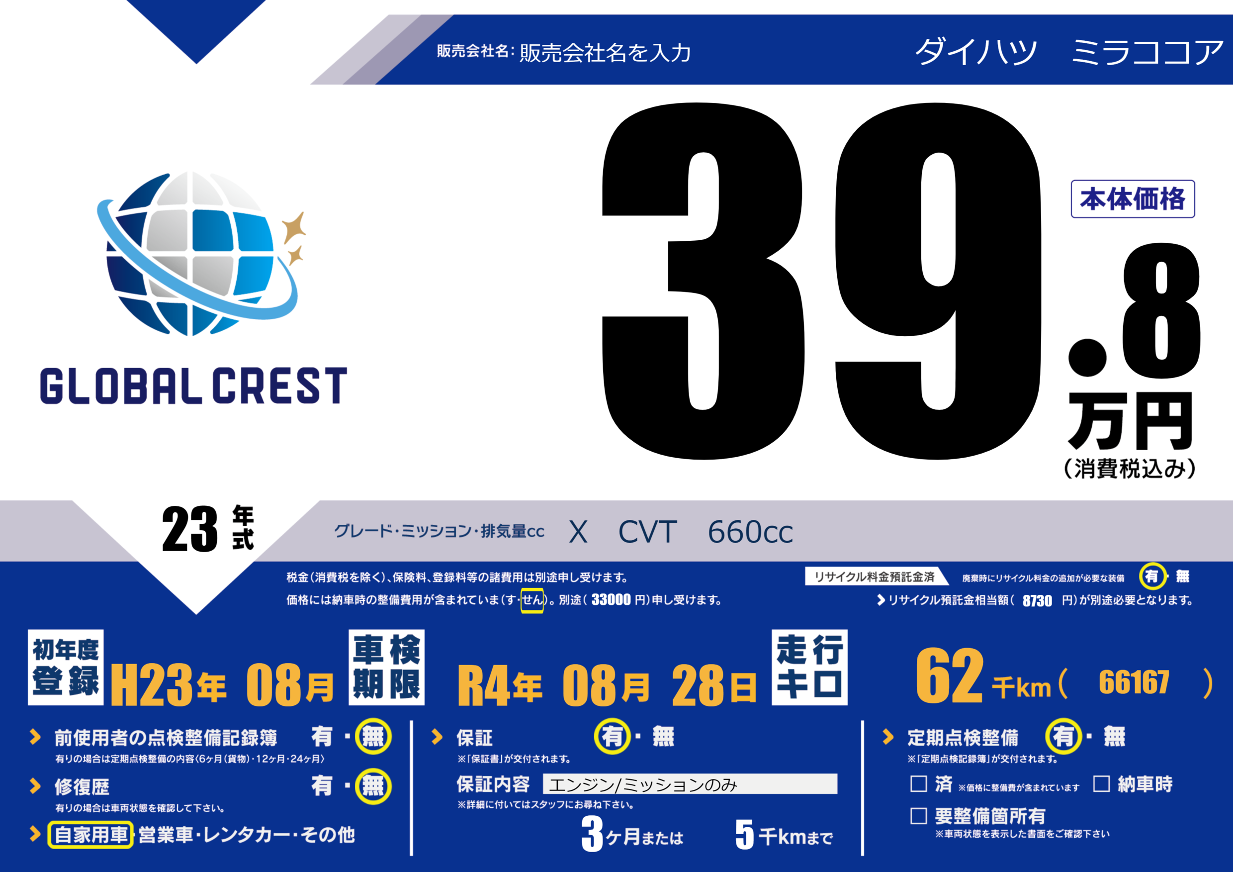 | 車名 | ダイハツ ミラココア | グレード ミッション 排気量 |