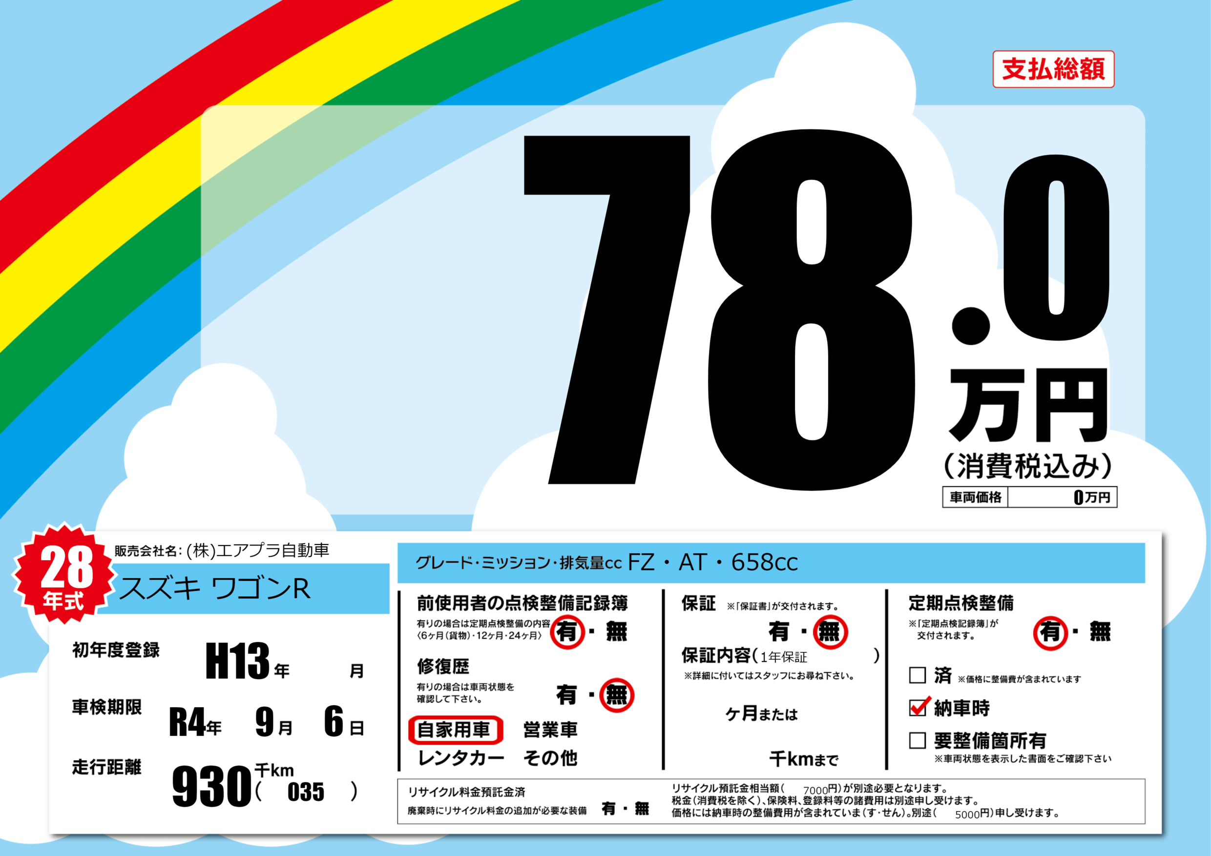 | 車名 | スズキ ワゴンR | グレード ミッション 排気量 |