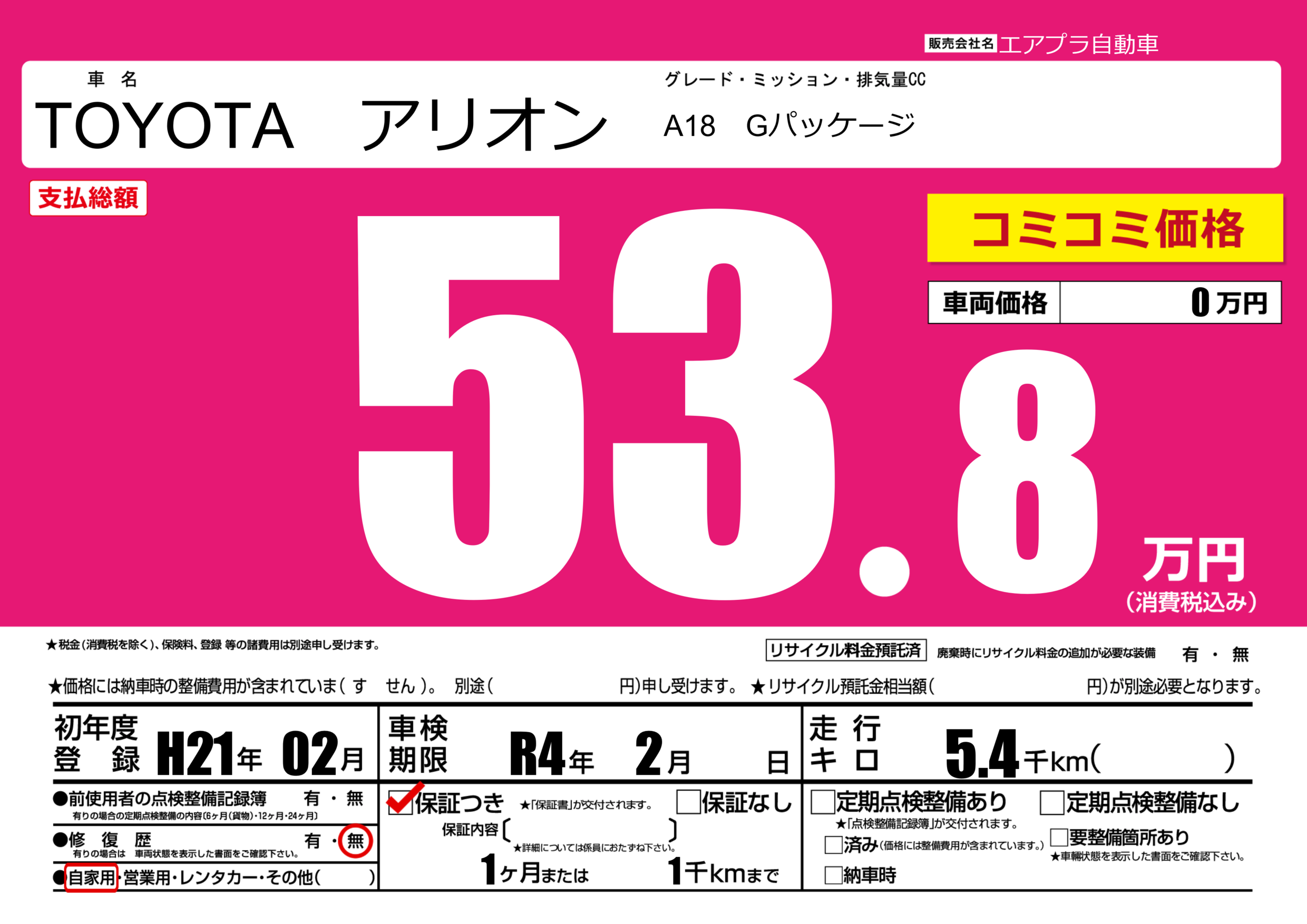 | 車名 | TOYOTA アリオン | グレード ミッション 排気量 |