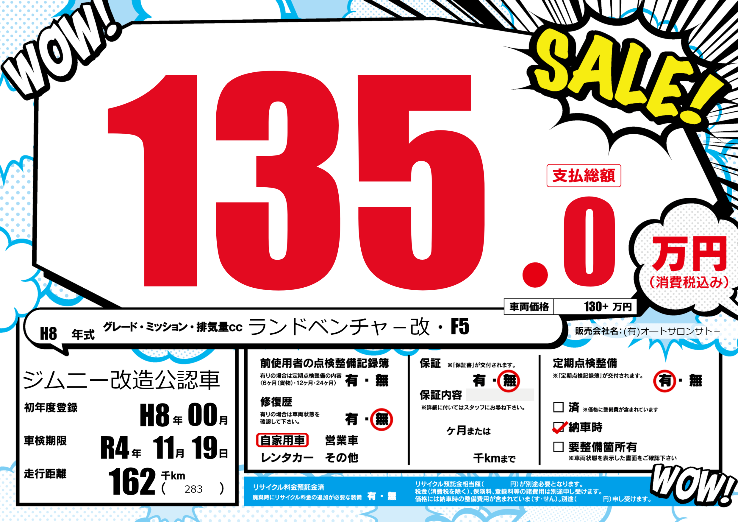 | 走行キロ | 16.2万km | 初年度登録 | H8年00月 |