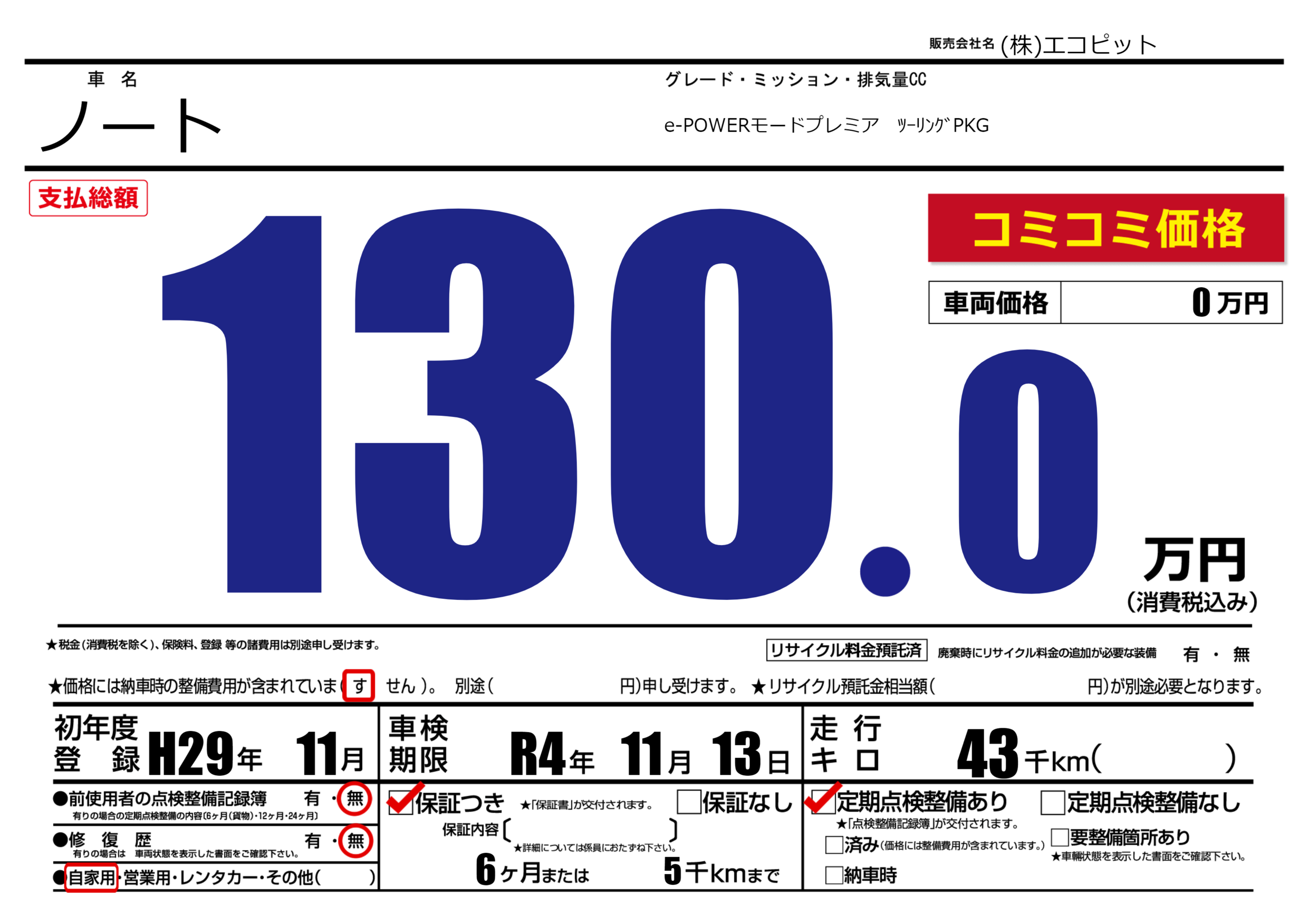 保証付き 保証内容(---) 6ヶ月または(5)千kmまで |