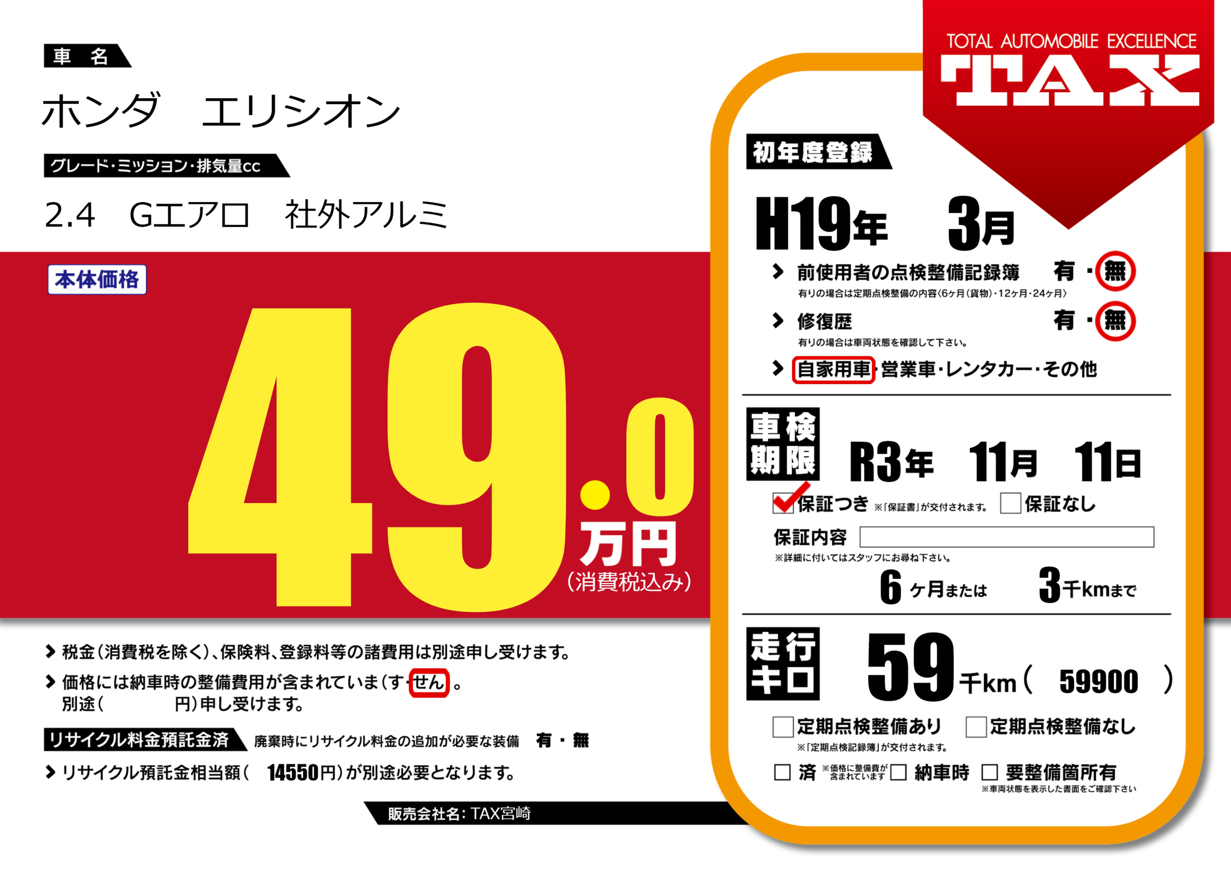 | 車名 | ホンダ エリシオン | グレード ミッション 排気量 |