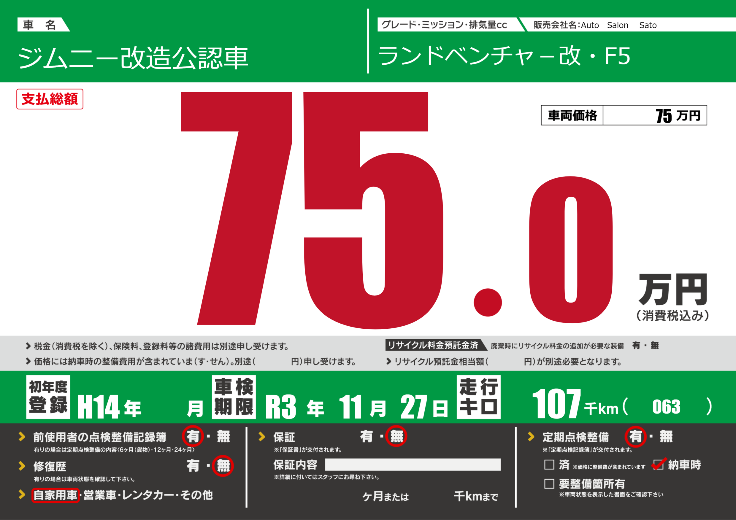 なし | 車検制限 | R3年11月27月 |