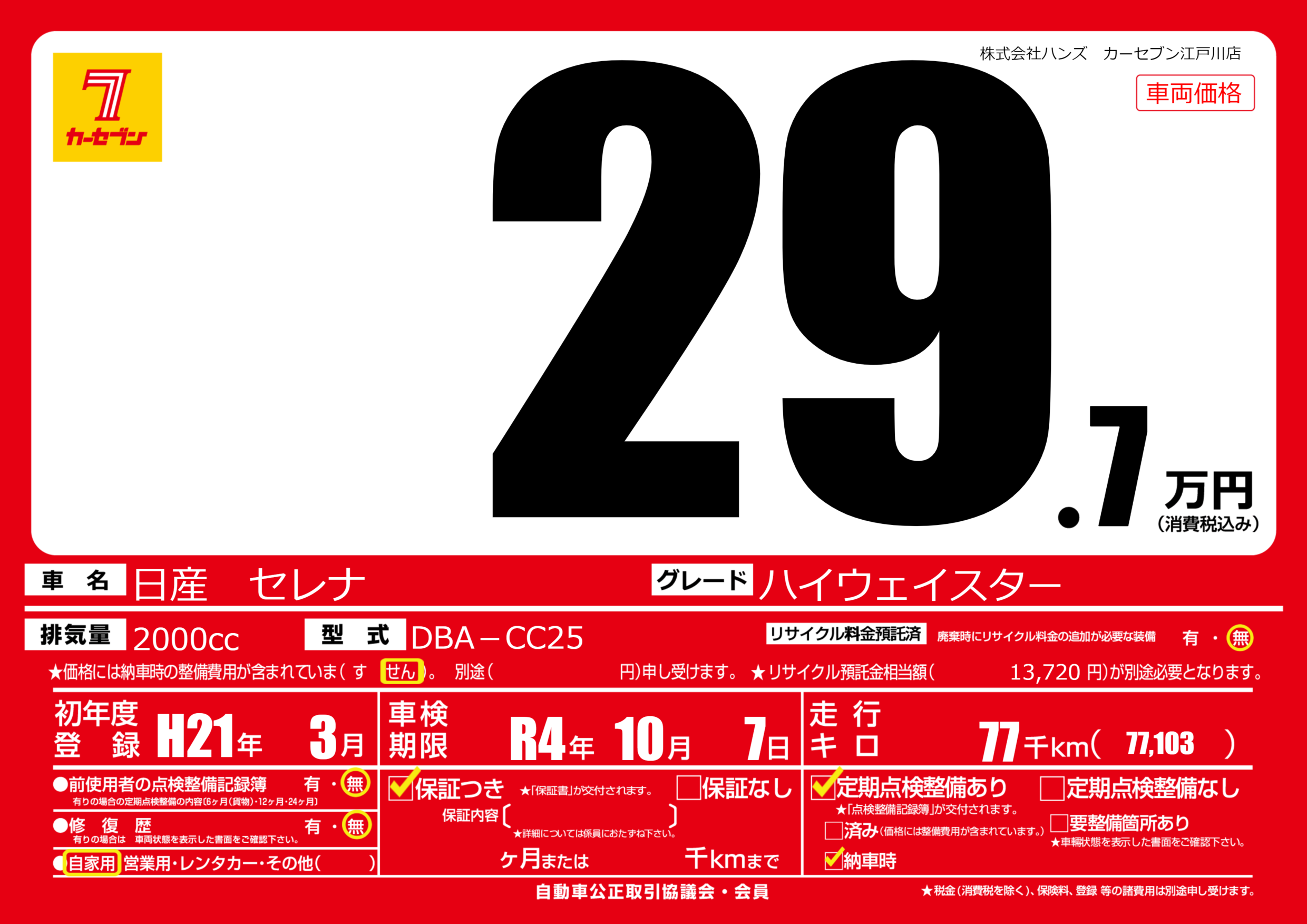 | 走行キロ | 7.7万km | 初年度登録 | H21年3月 |