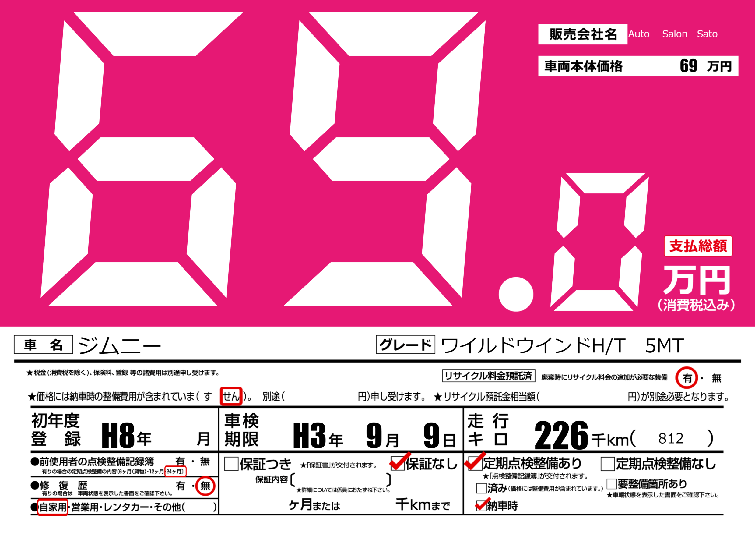 なし | 車検制限 | H3年9月9月 |