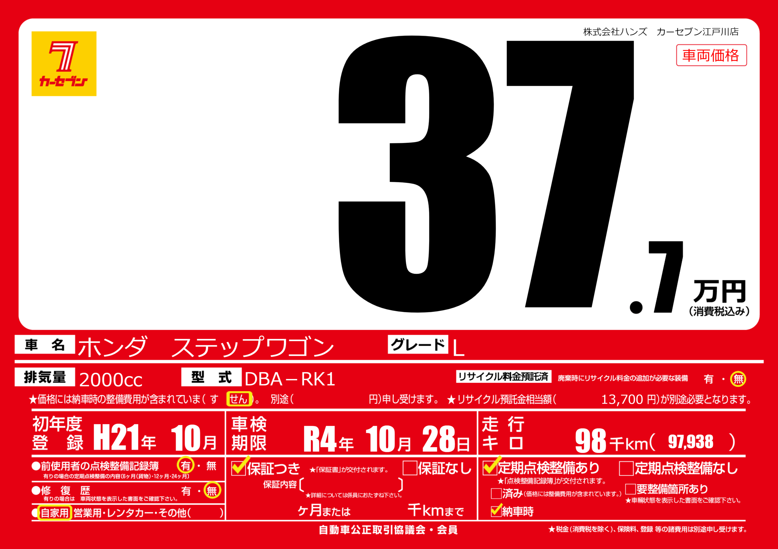 | 車名 | ホンダ ステップワゴン | グレード ミッション 排気量 |