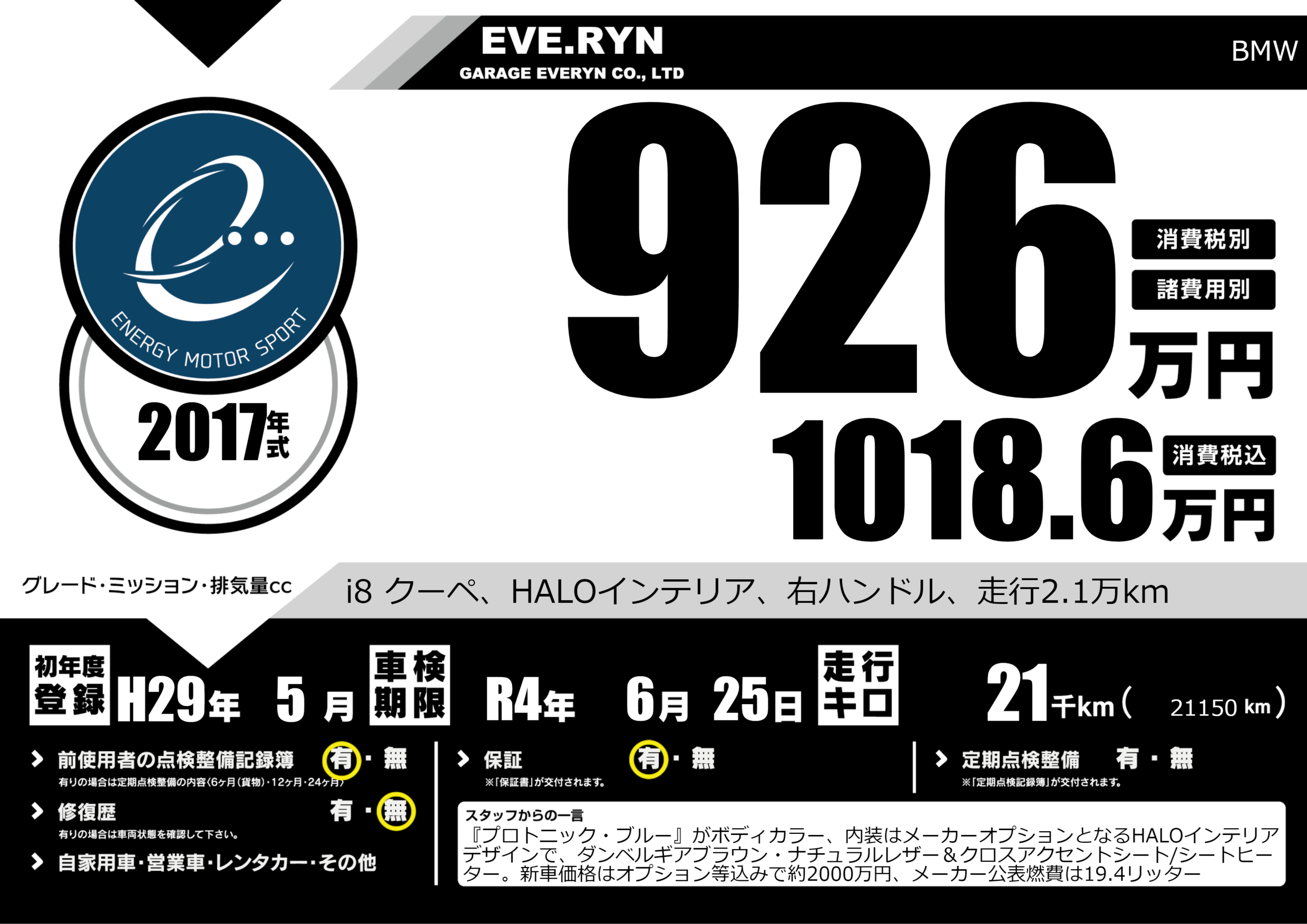 i8 クーペ、HALOインテリア、右ハンドル、走行2.1万km |