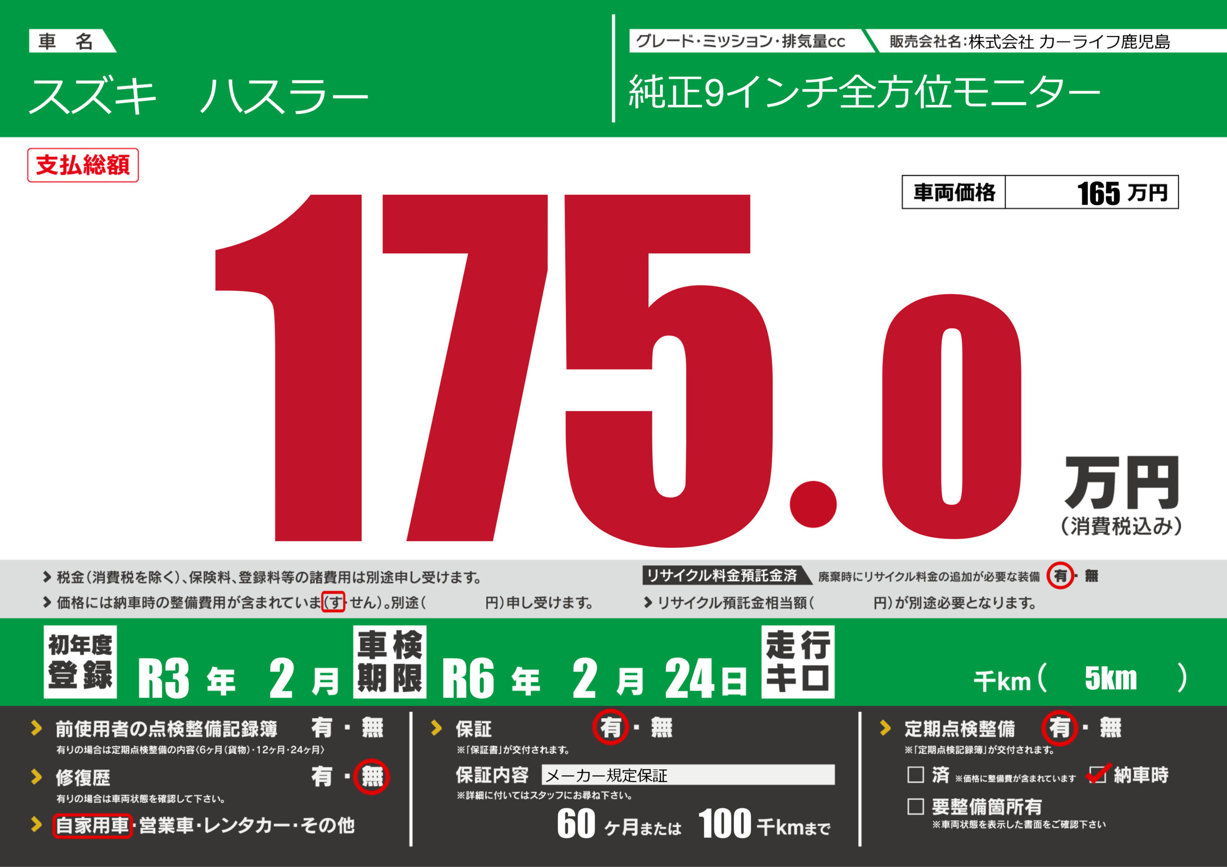 | 定期点検整備 | 定期点検整備あり 納車時あり | ||