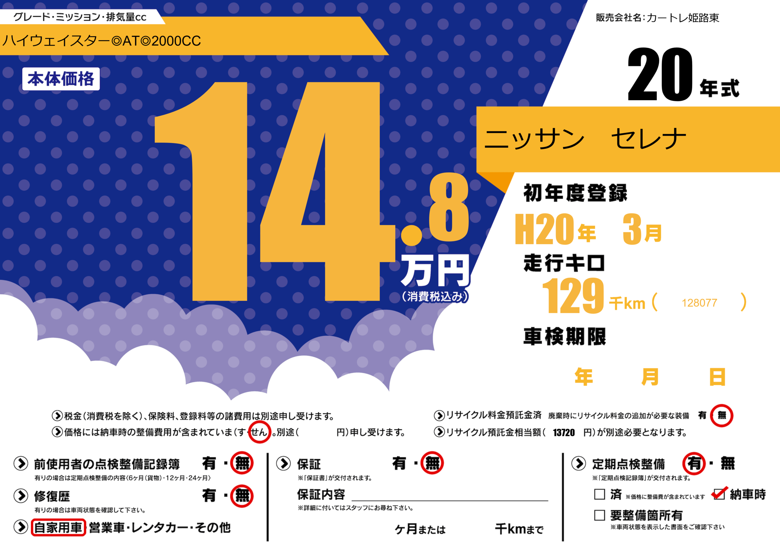 | 走行キロ | 12.9万km | 初年度登録 | H20年3月 |