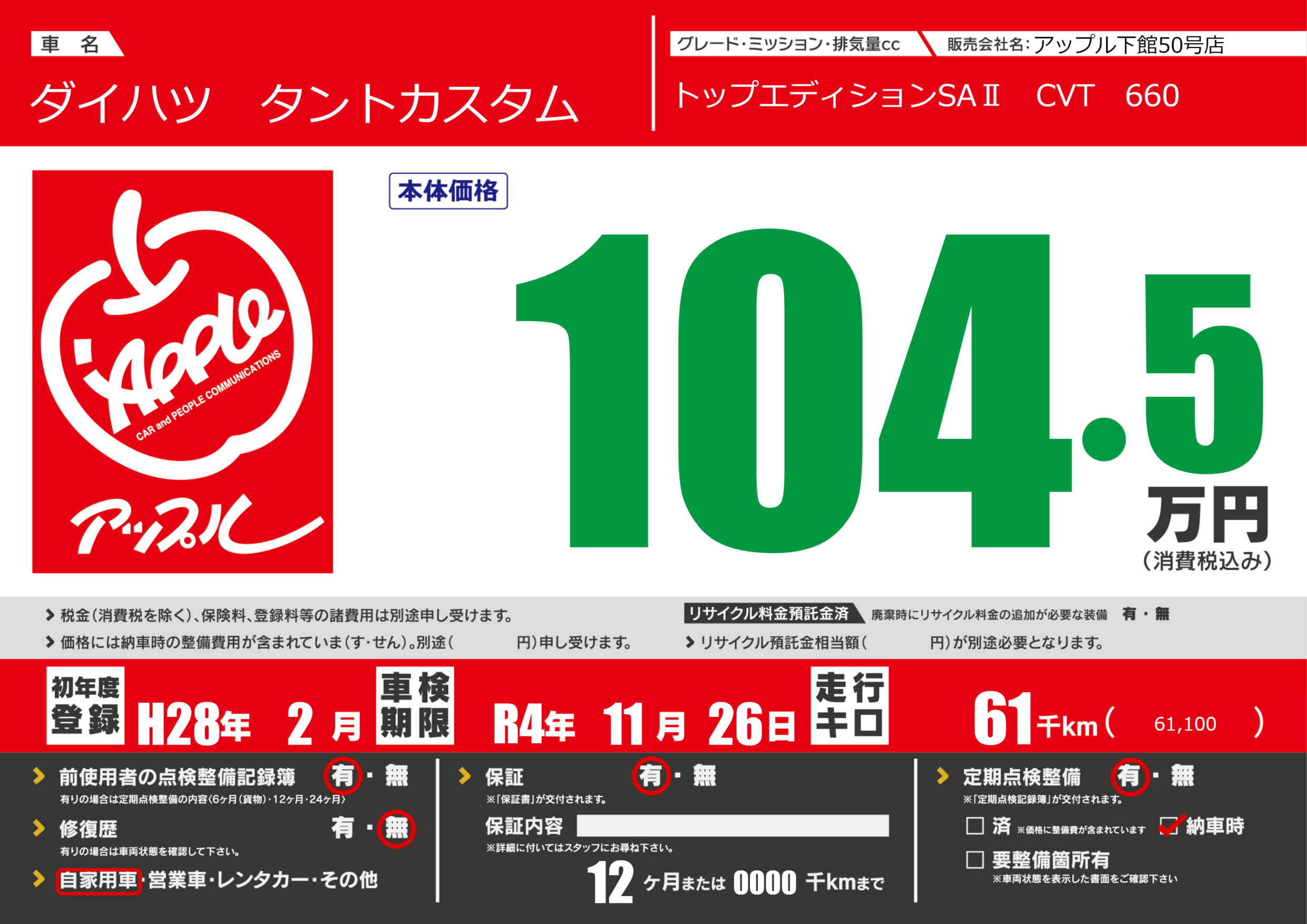 なし | 車検制限 | R4年11月26月 |