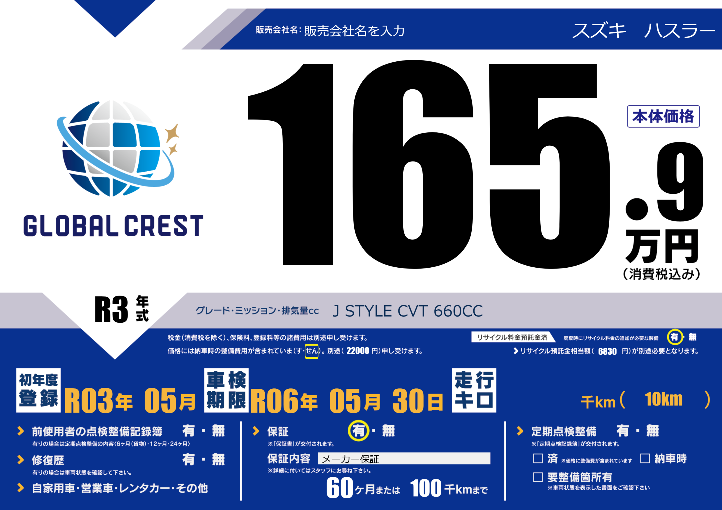 | 車名 | スズキ ハスラー | グレード ミッション 排気量 |