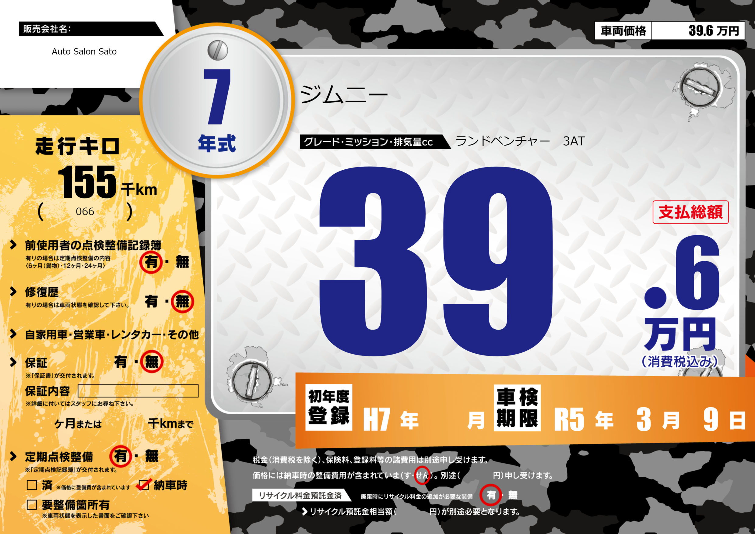 | 走行キロ | 15.5万km | 初年度登録 | H7年---月 |