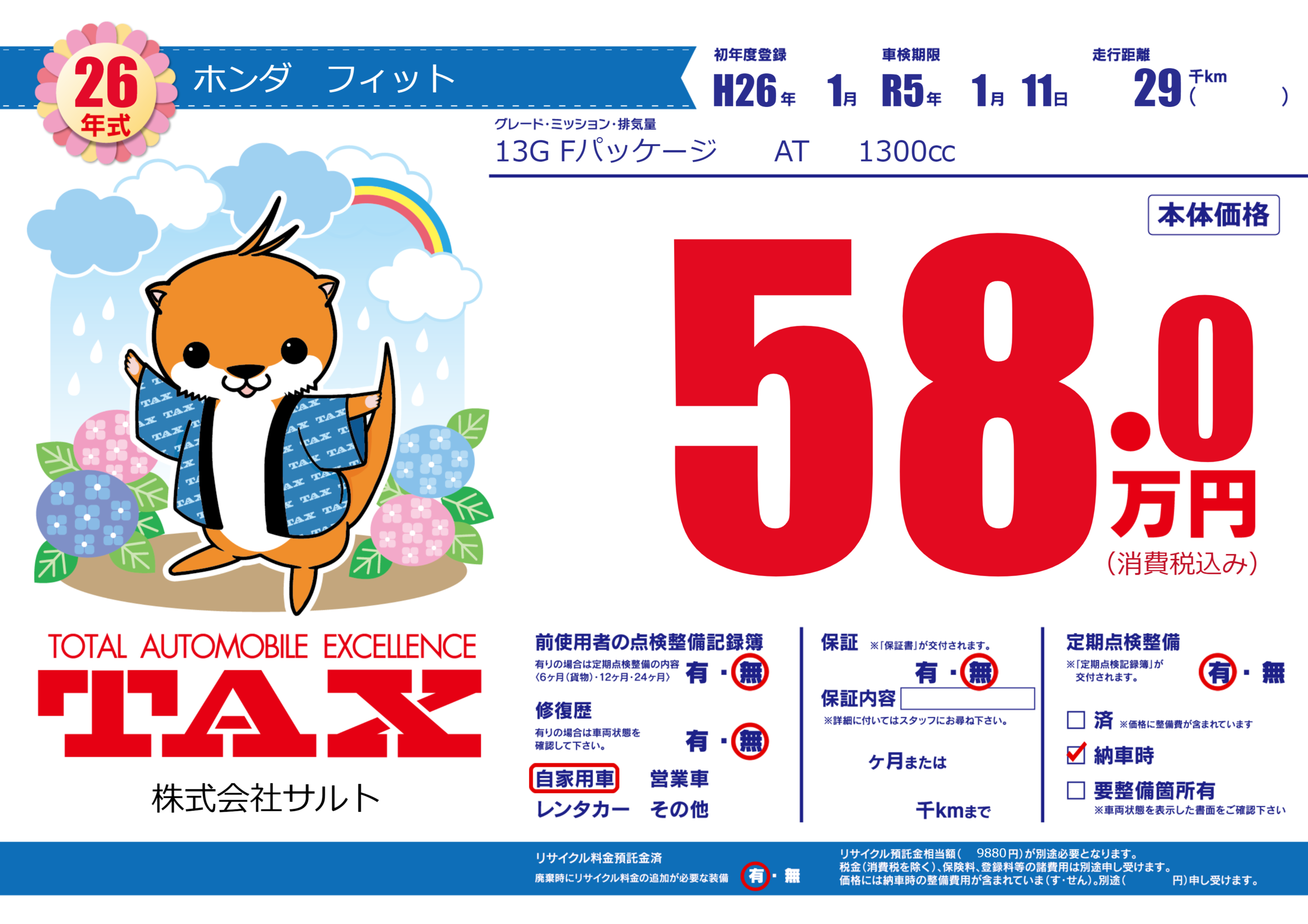 | 走行キロ | 2.9万km | 初年度登録 | H26年1月 |