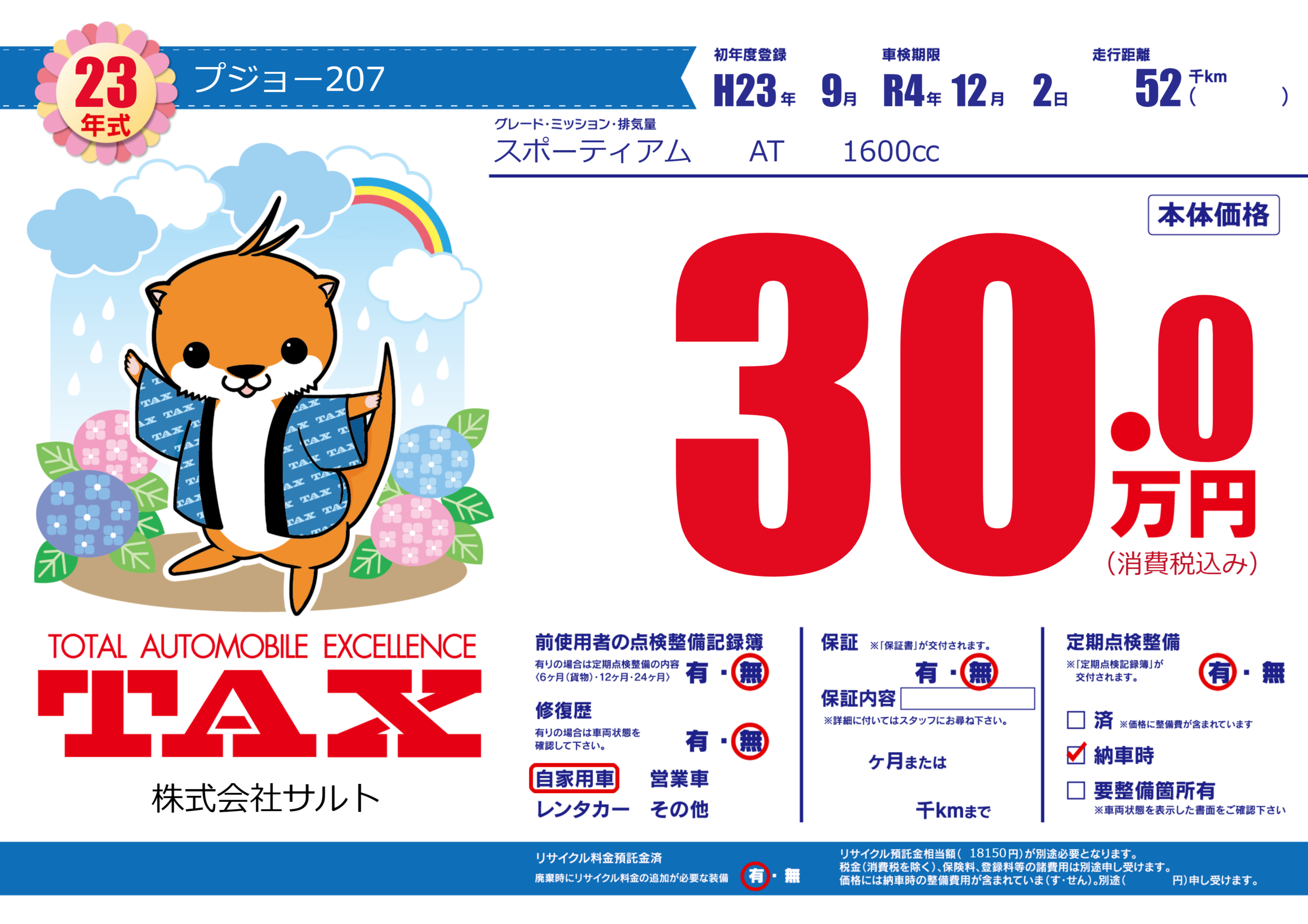 | 車名 | プジョー207 | グレード ミッション 排気量 |