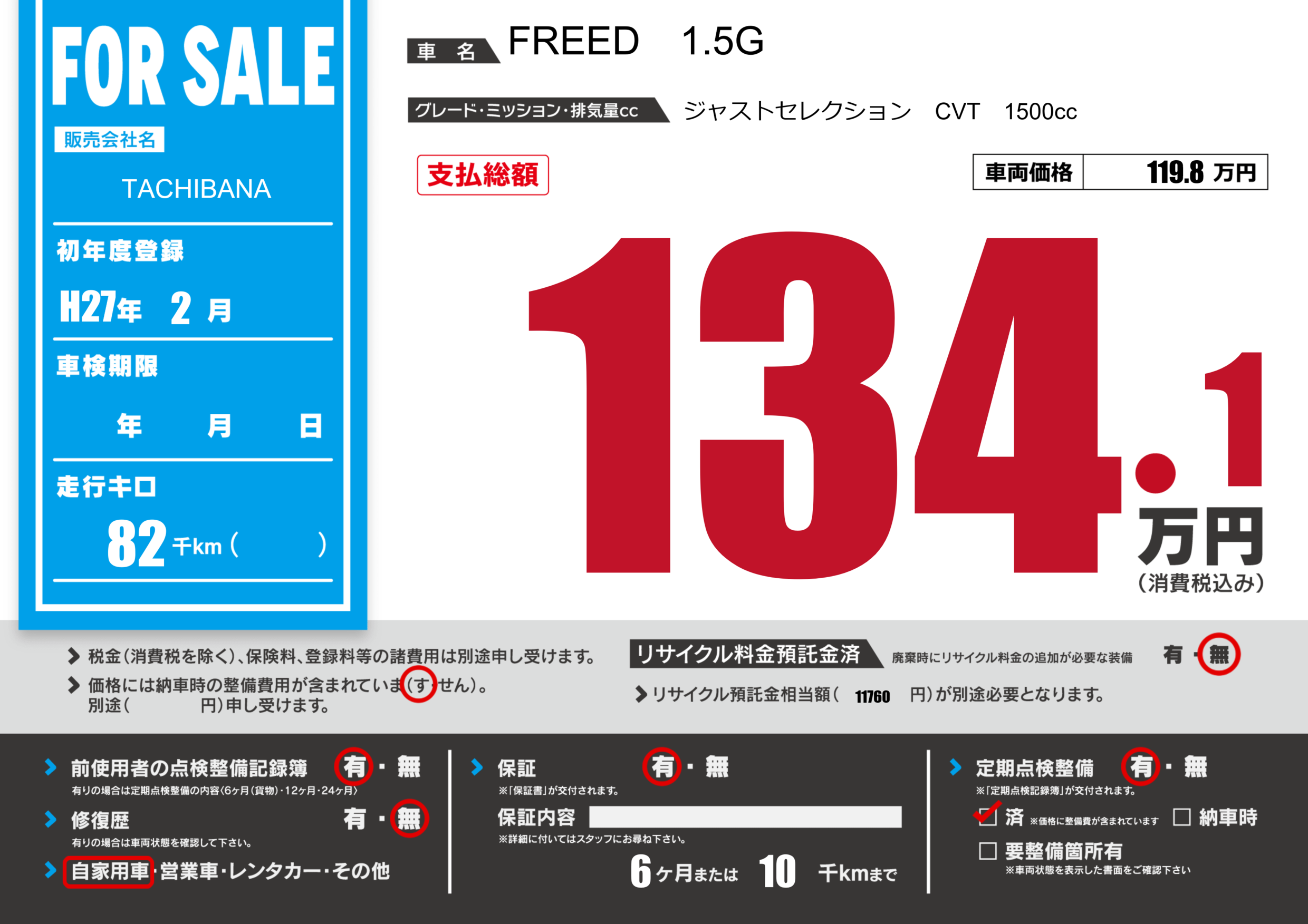 | 車名 | FREED 1.5G | グレード ミッション 排気量 |