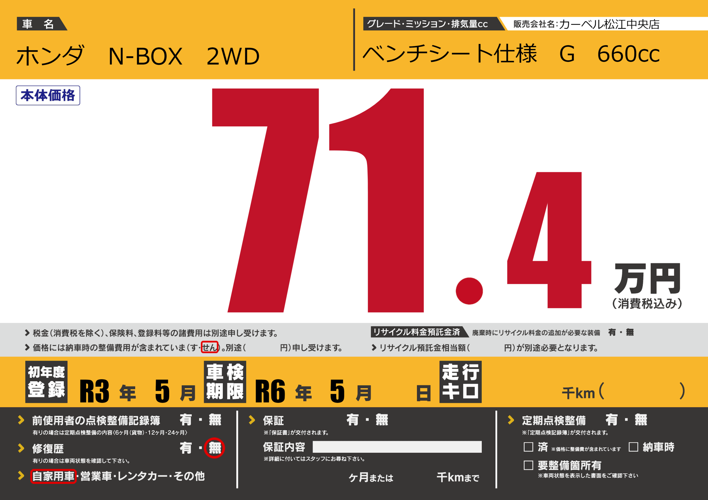| 車名 | ホンダ N-BOX 2WD | グレード ミッション 排気量 |