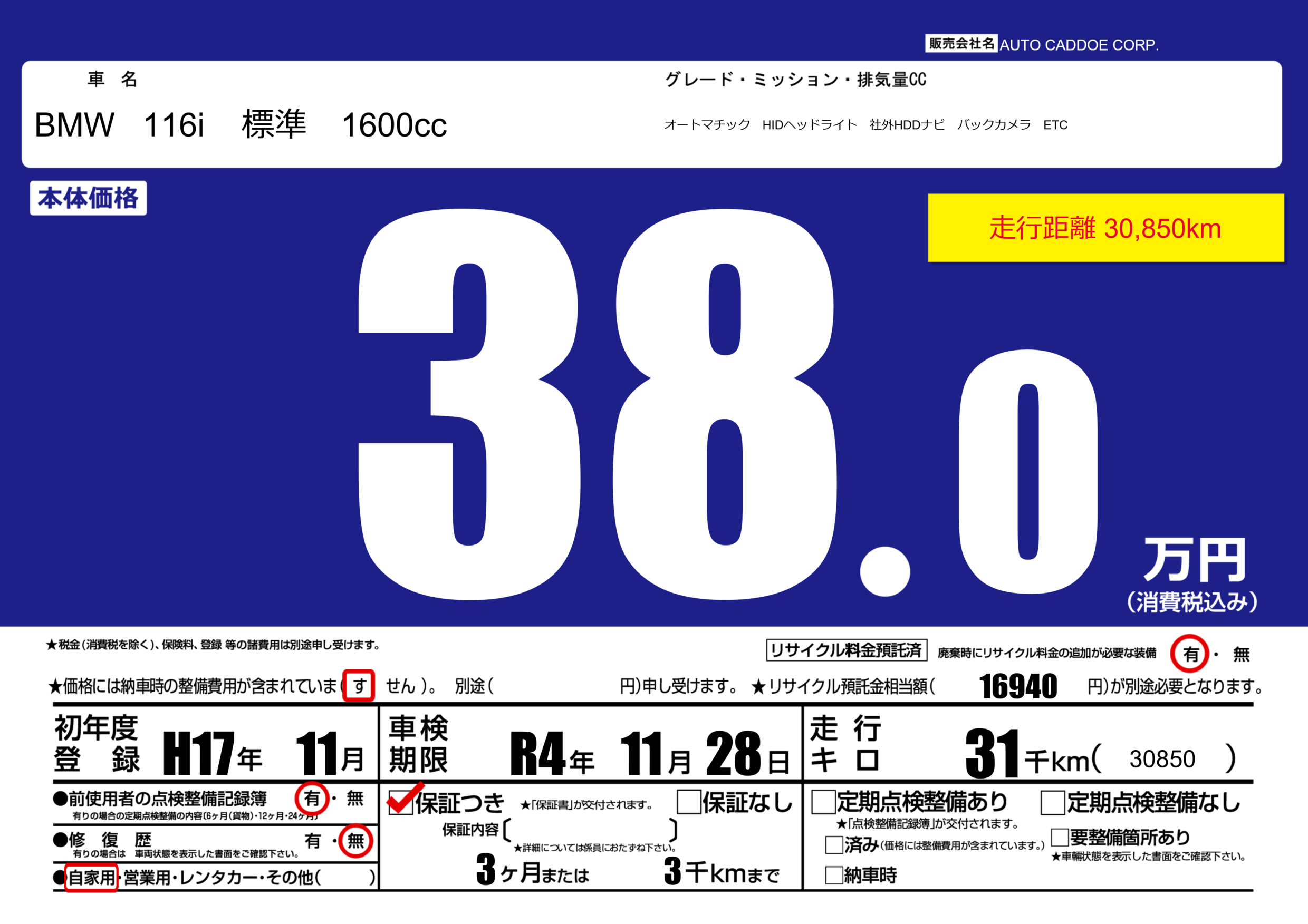 | 車名 | BMW 116i 標準 1600cc | グレード ミッション 排気量 |