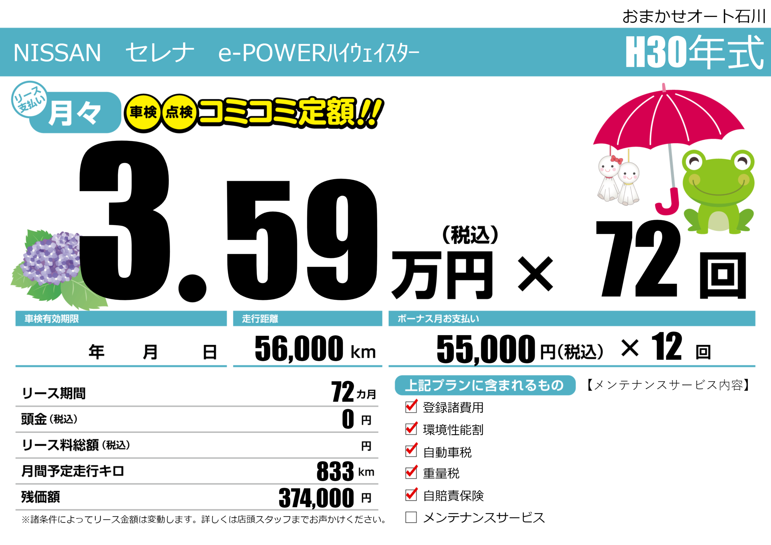 | 車名 | NISSAN セレナ e-POWERハイウェイスター | グレード ミッション 排気量 |