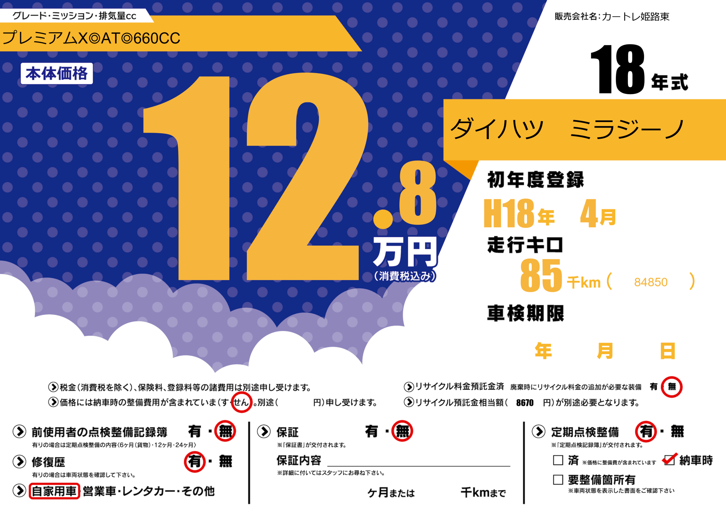 | 定期点検整備 | 定期点検整備あり 納車時あり | ||