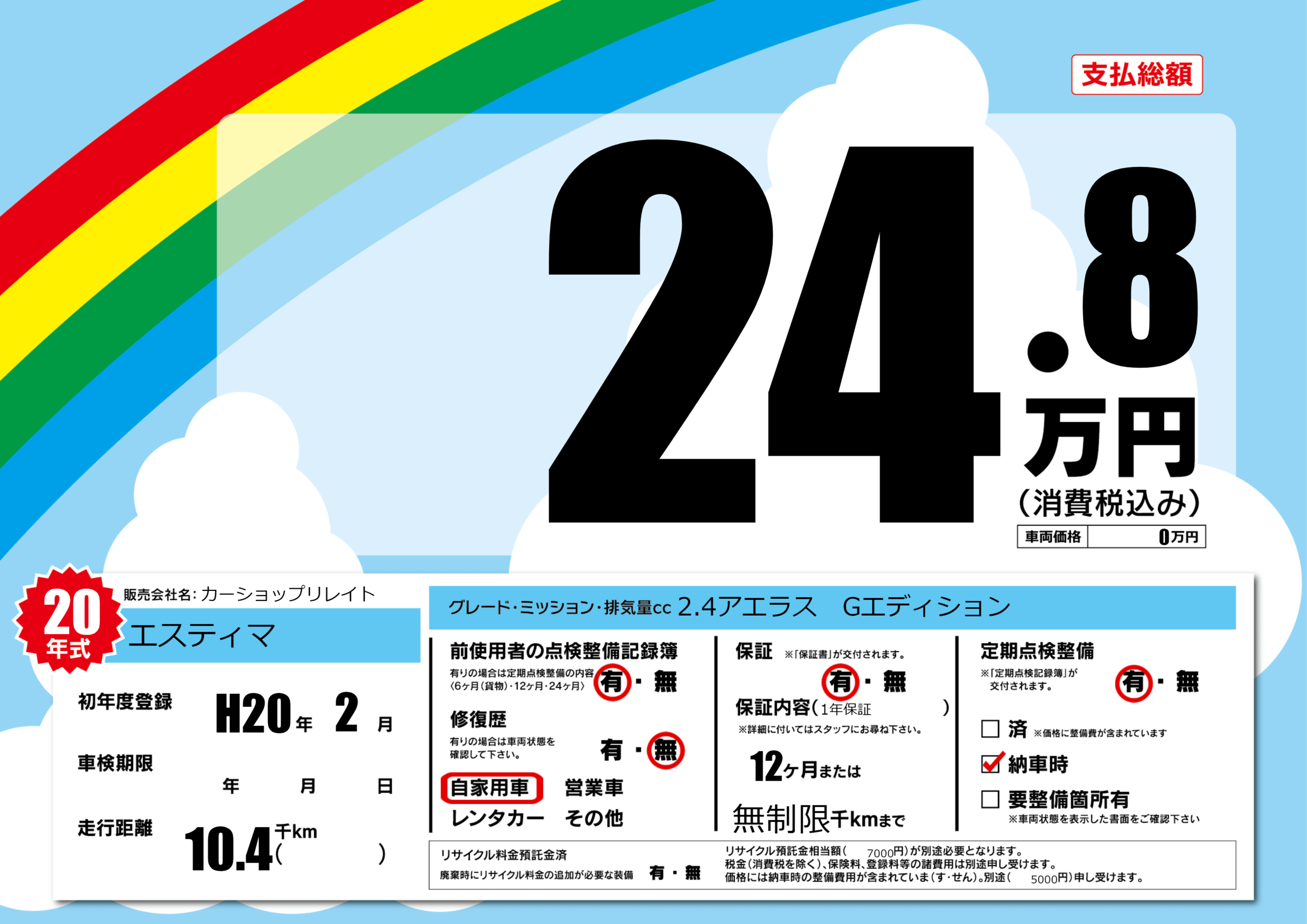 | 定期点検整備 | 定期点検整備あり 納車時あり | ||