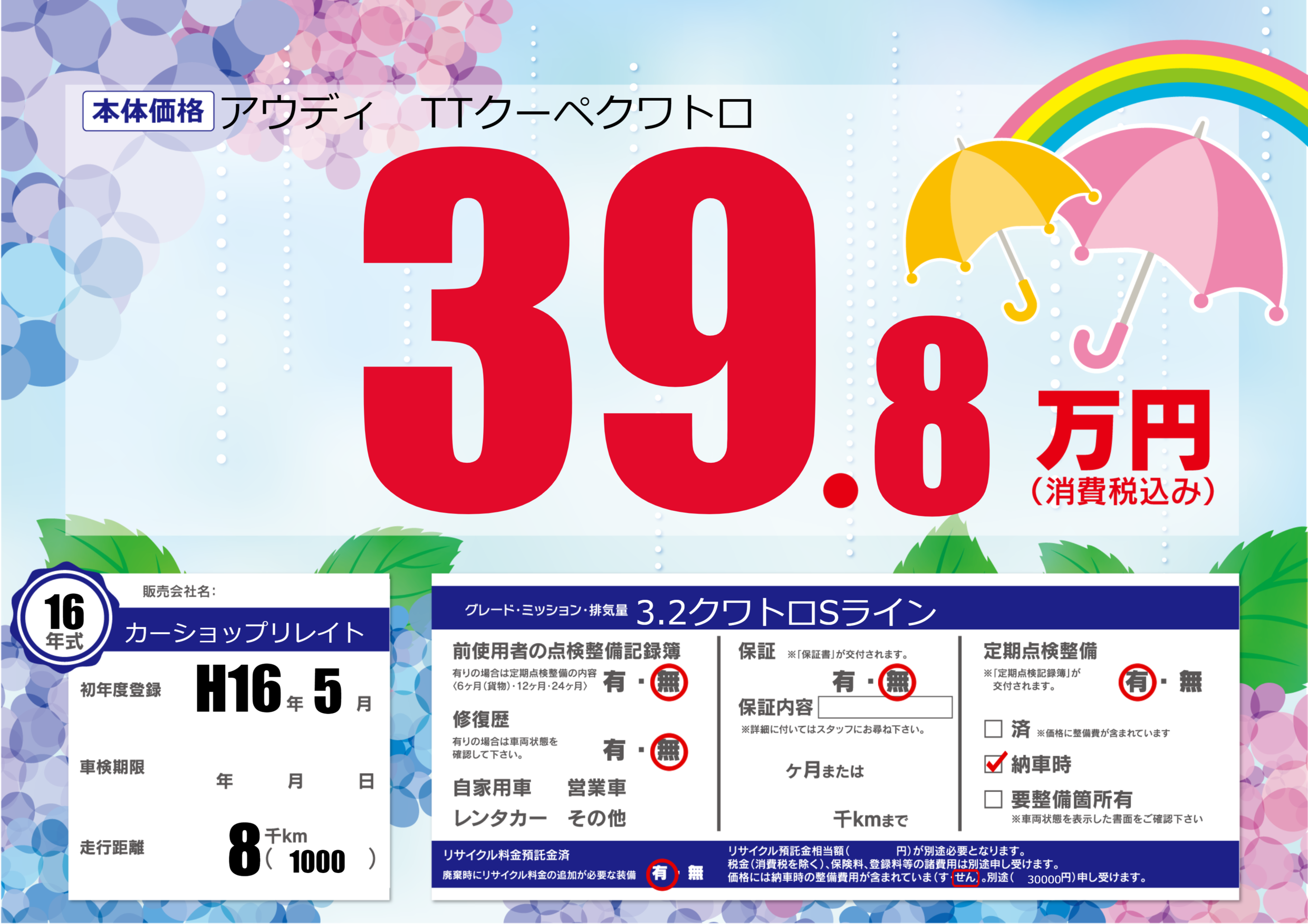 | 走行キロ | 0.8万km | 初年度登録 | H16年5月 |