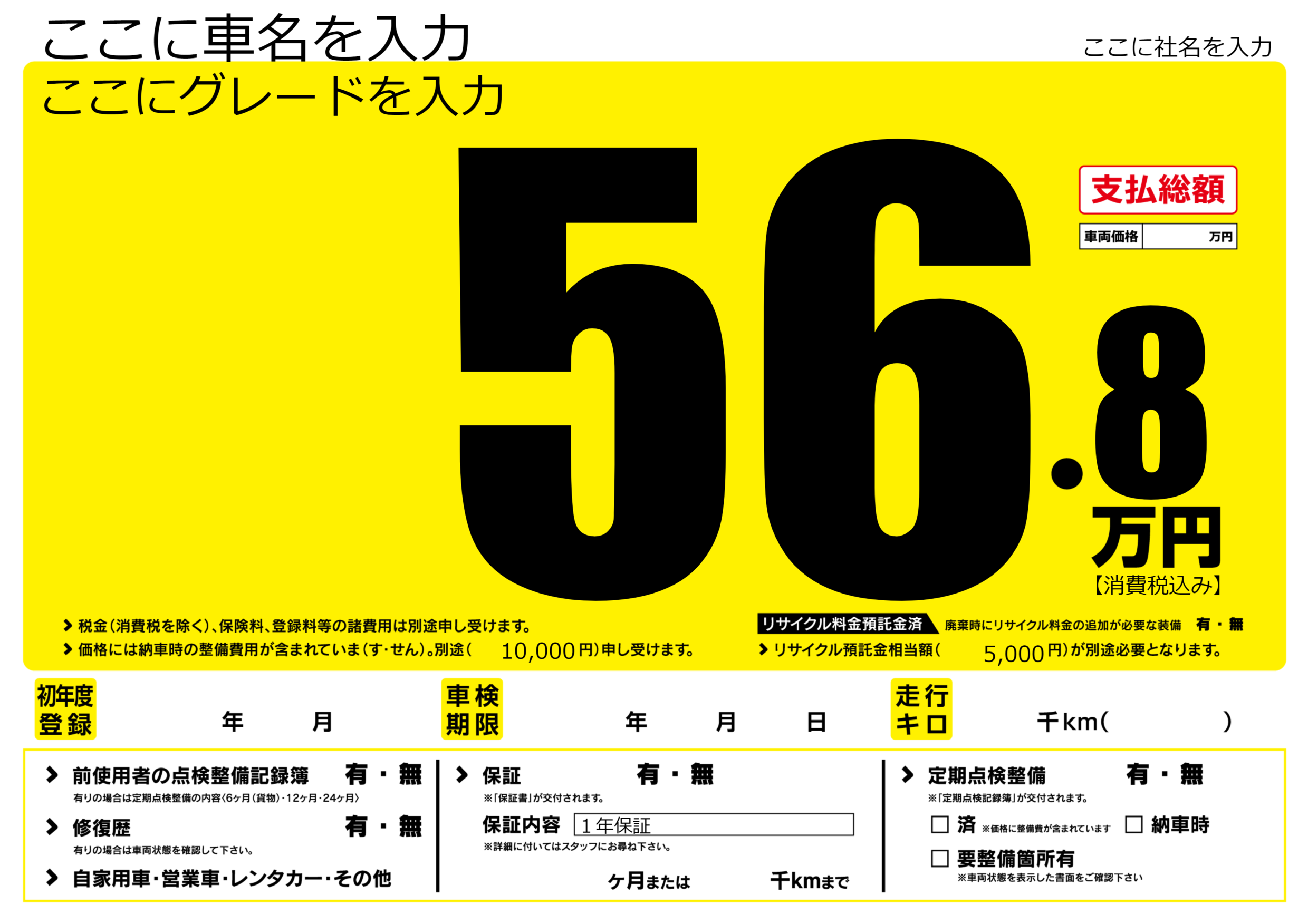 | 車名 | ここに車名を入力 | グレード ミッション 排気量 |
