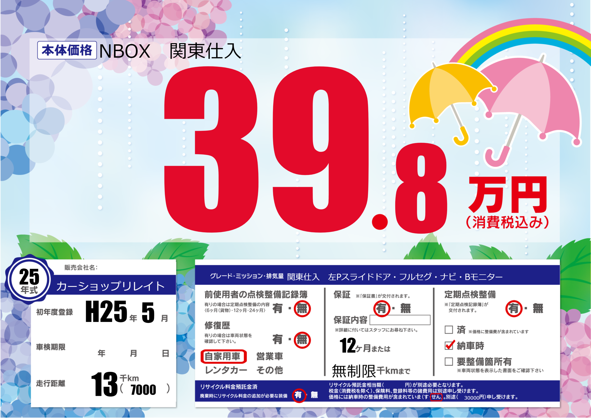 | 車名 | NBOX 関東仕入 | グレード ミッション 排気量 |