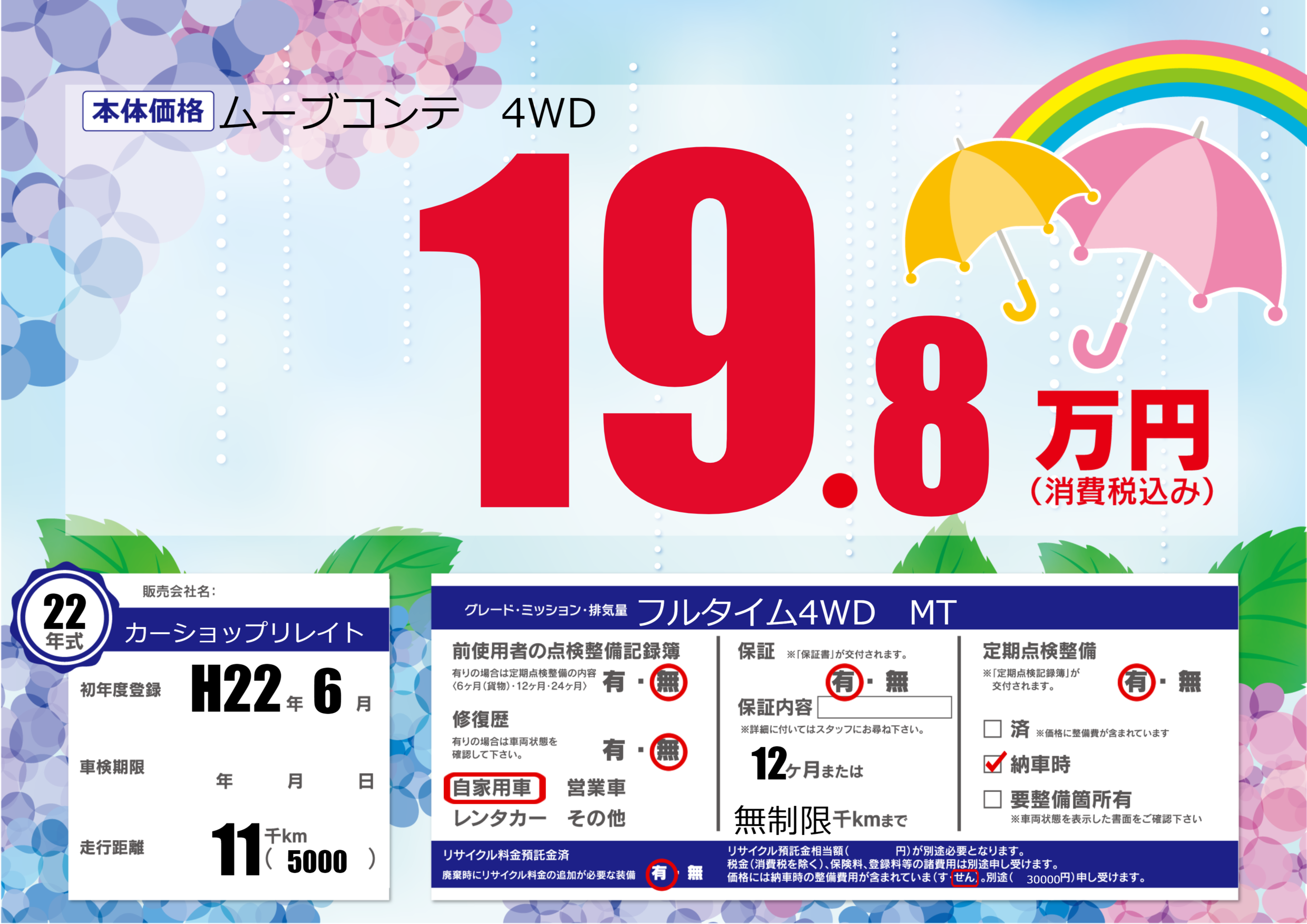 | 車名 | ムーブコンテ 4WD | グレード ミッション 排気量 |