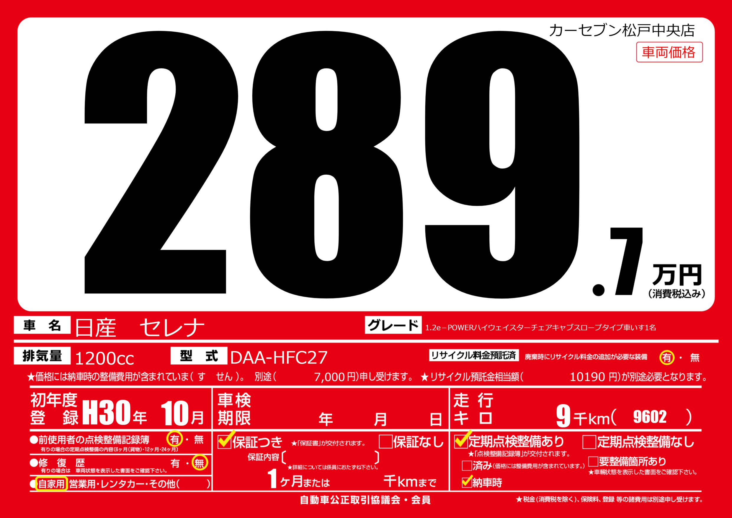 | 車名 | 日産 セレナ | グレード ミッション 排気量 |