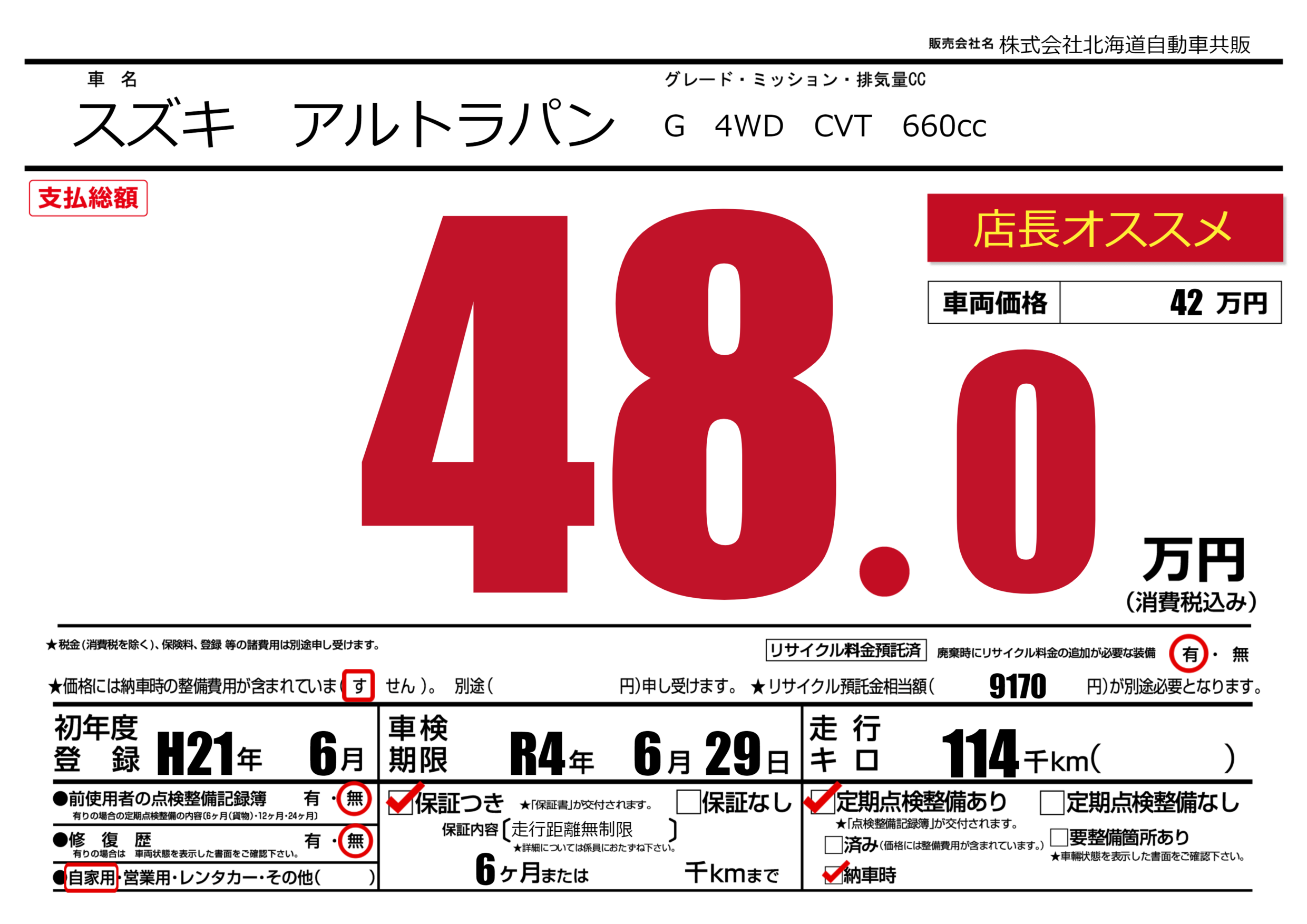 | 走行キロ | 11.4万km | 初年度登録 | H21年6月 |