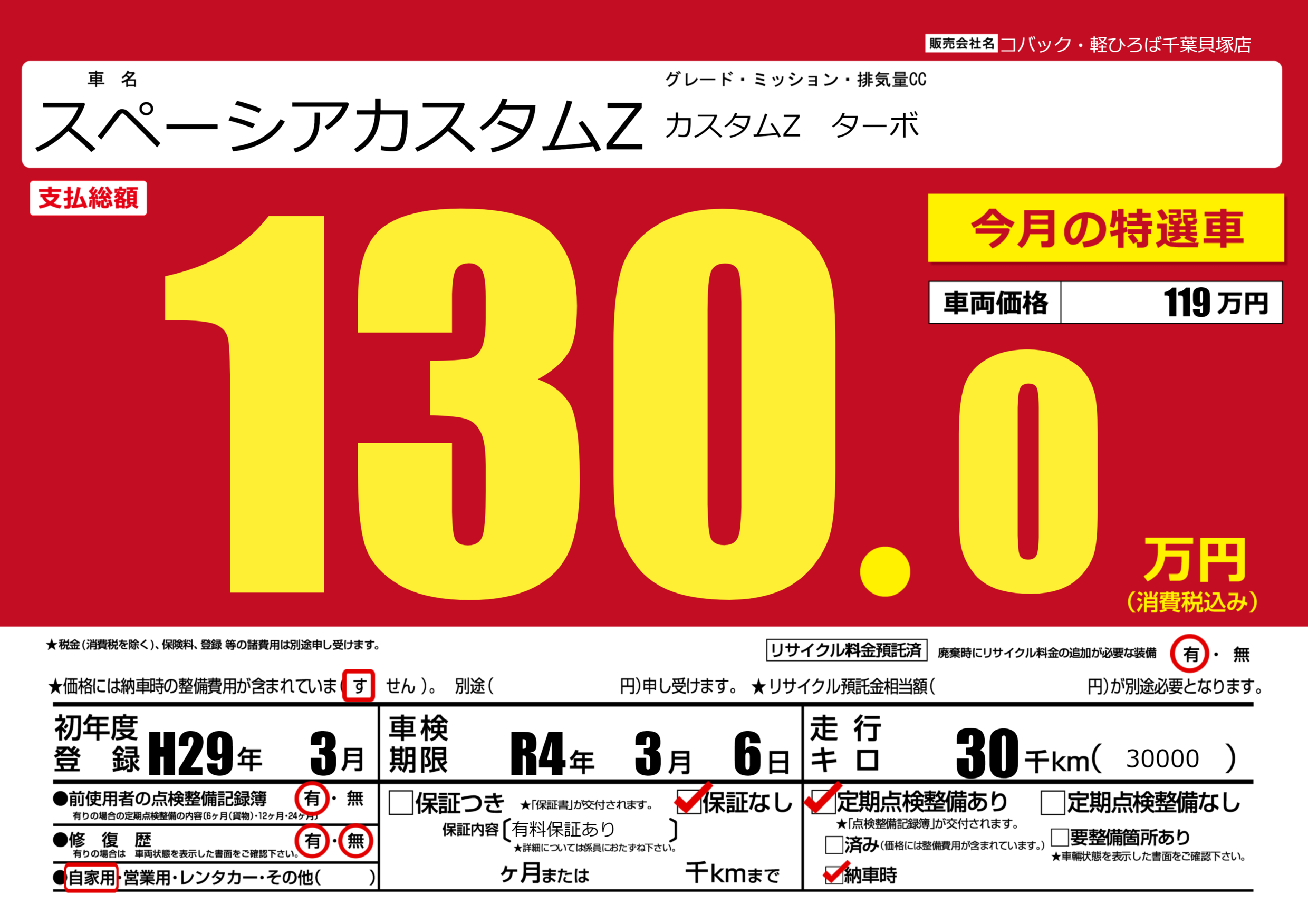 | 走行キロ | 3万km | 初年度登録 | H29年3月 |
