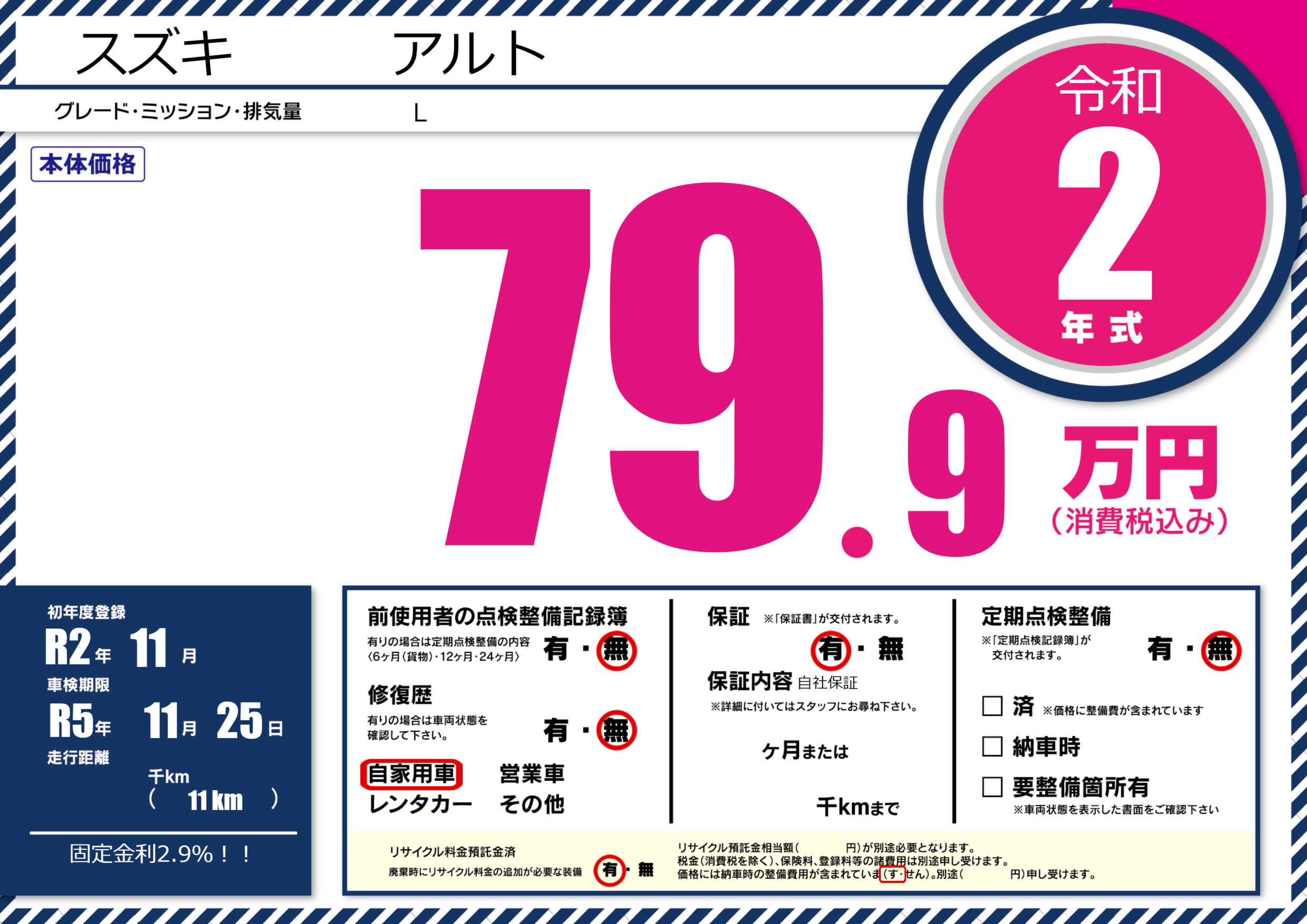 | 走行キロ | - | 初年度登録 | R2年11月 |