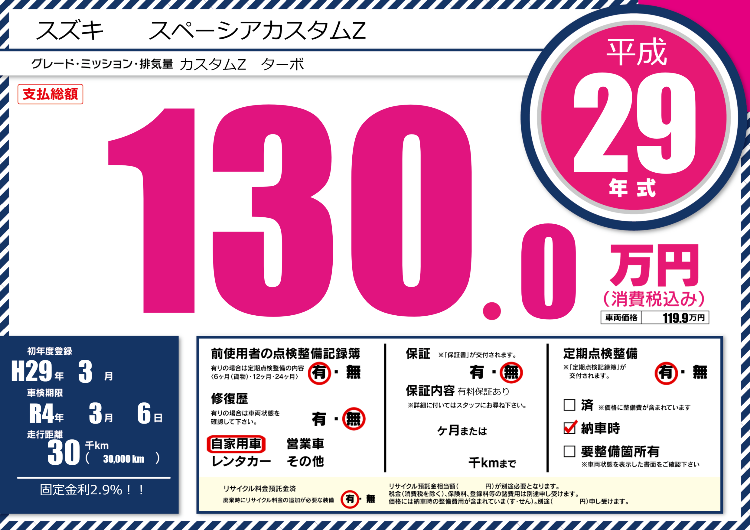 | 走行キロ | 3万km | 初年度登録 | H29年3月 |
