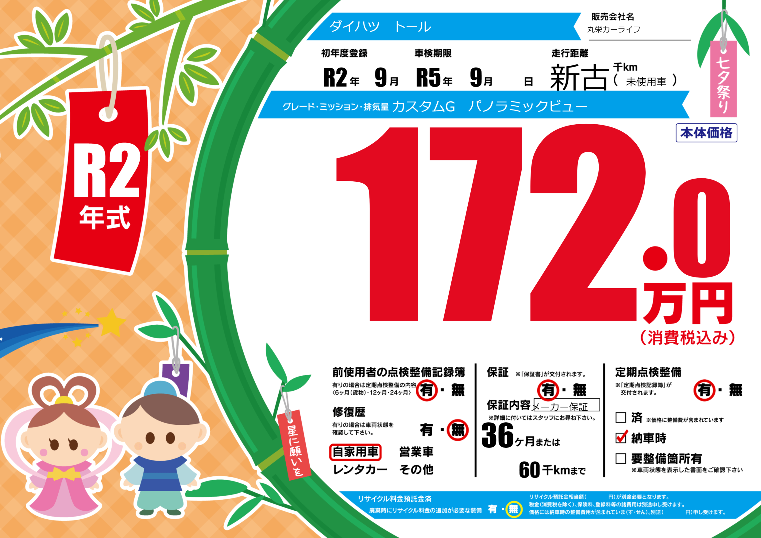 | 走行キロ | - | 初年度登録 | R2年9月 |