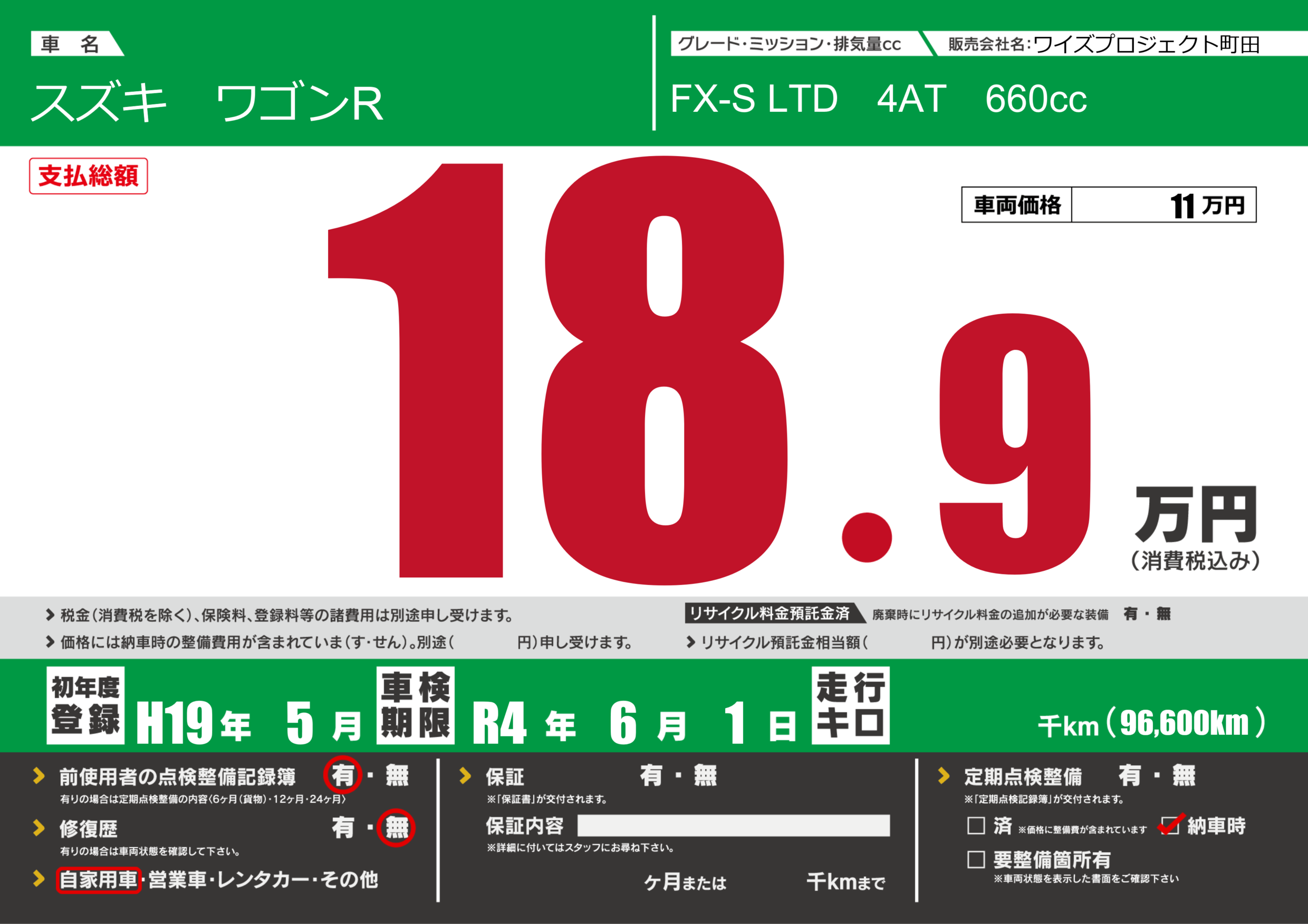 | 車名 | スズキ ワゴンR | グレード ミッション 排気量 |