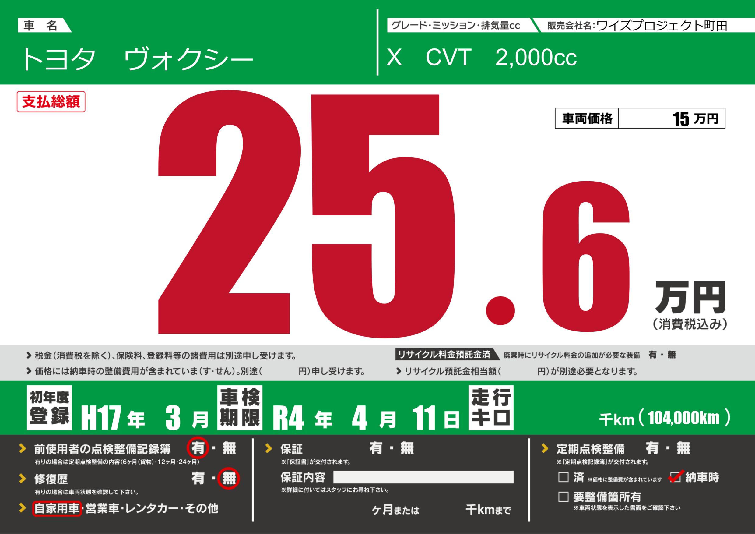| 車名 | トヨタ ヴォクシー | グレード ミッション 排気量 |