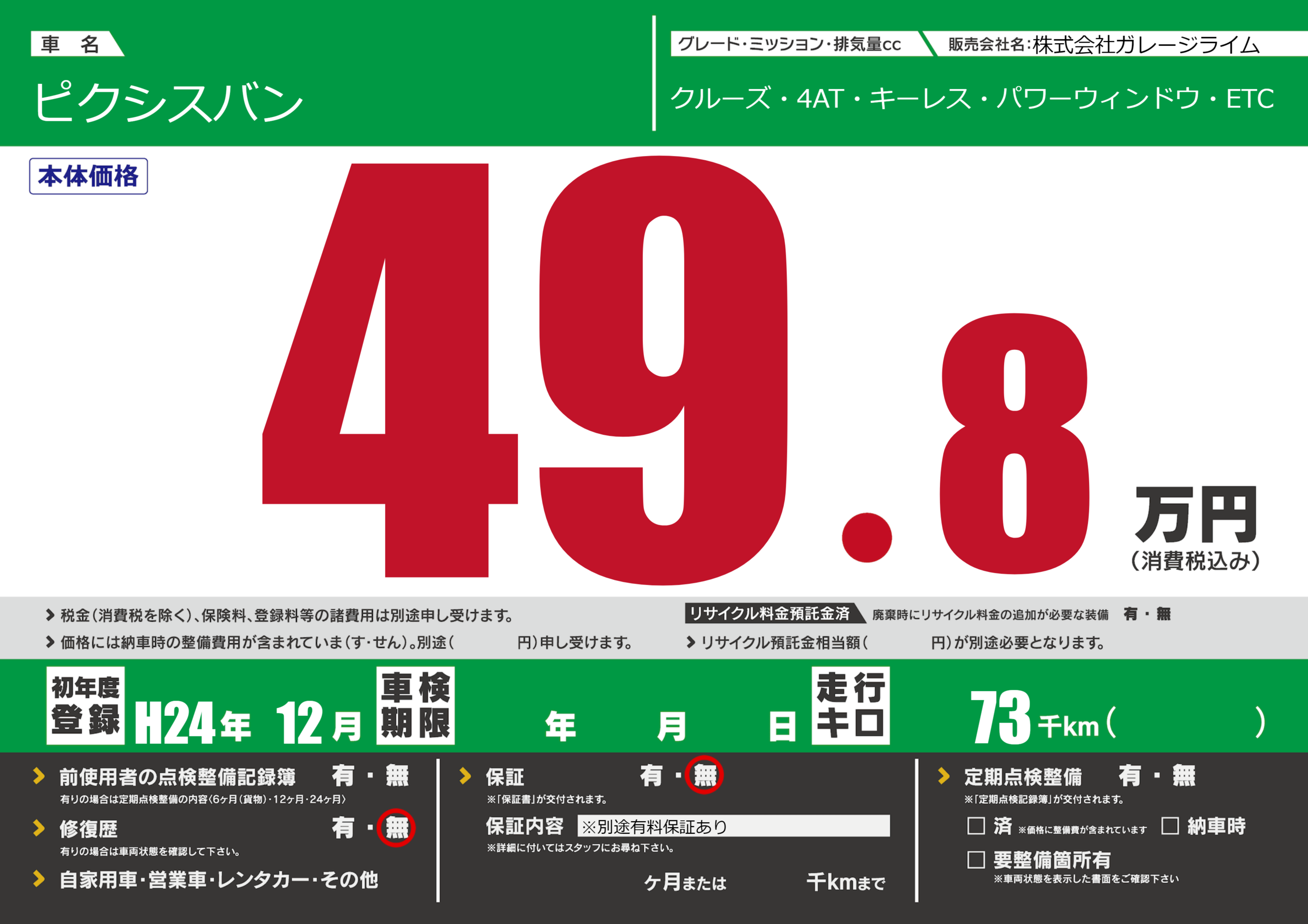 | 車名 | ピクシスバン | グレード ミッション 排気量 |