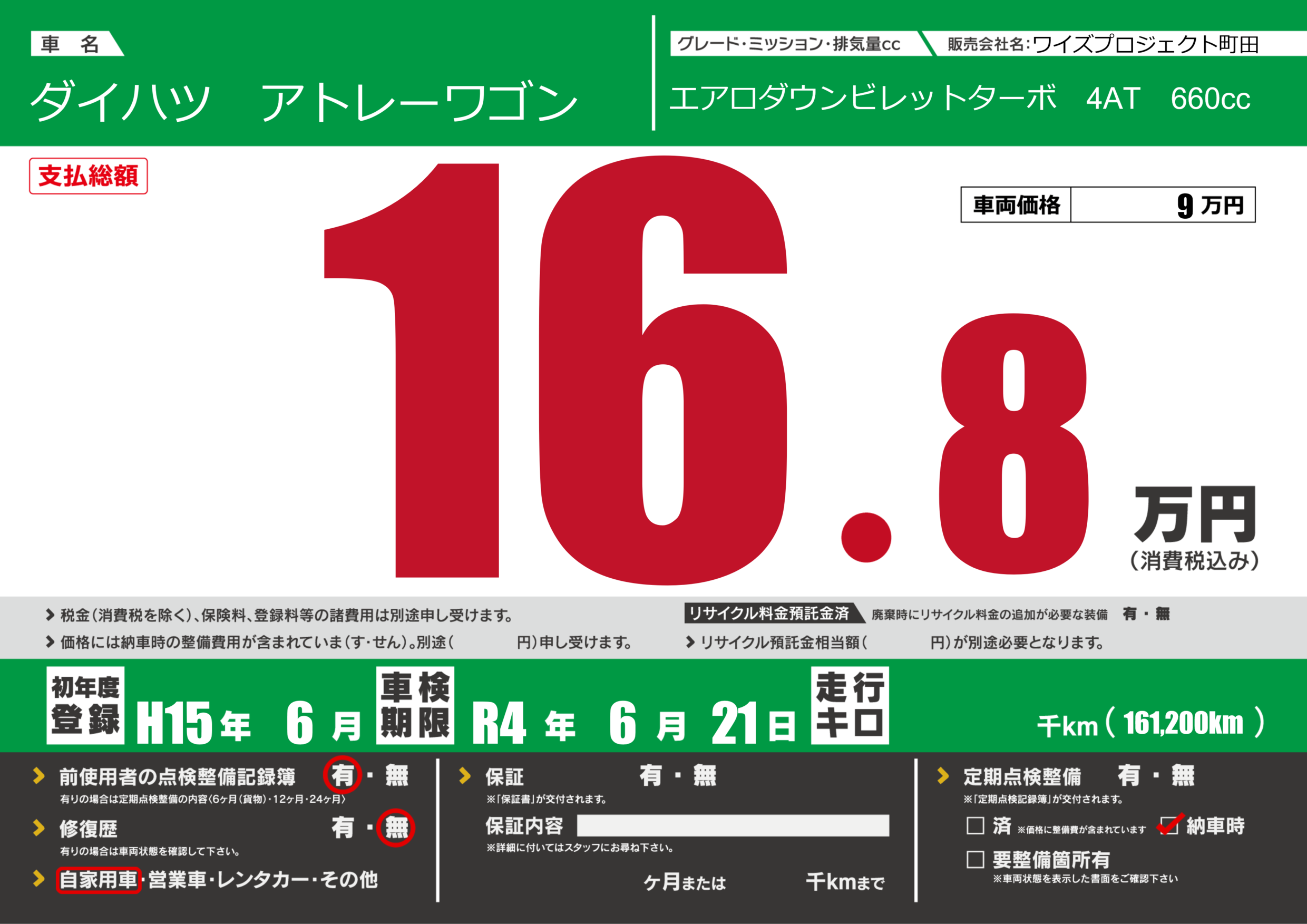 | 車名 | ダイハツ アトレーワゴン | グレード ミッション 排気量 |