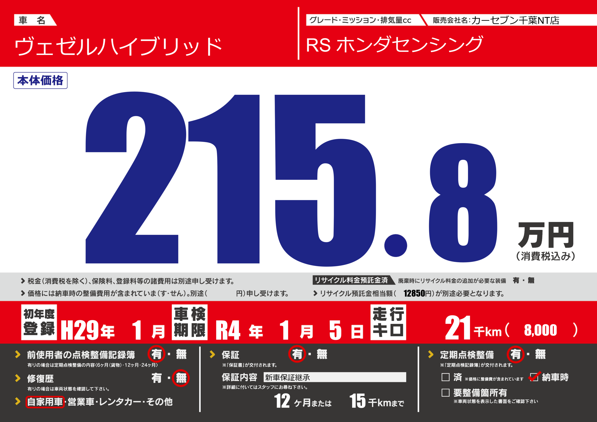 | 車名 | ヴェゼルハイブリッド | グレード ミッション 排気量 |