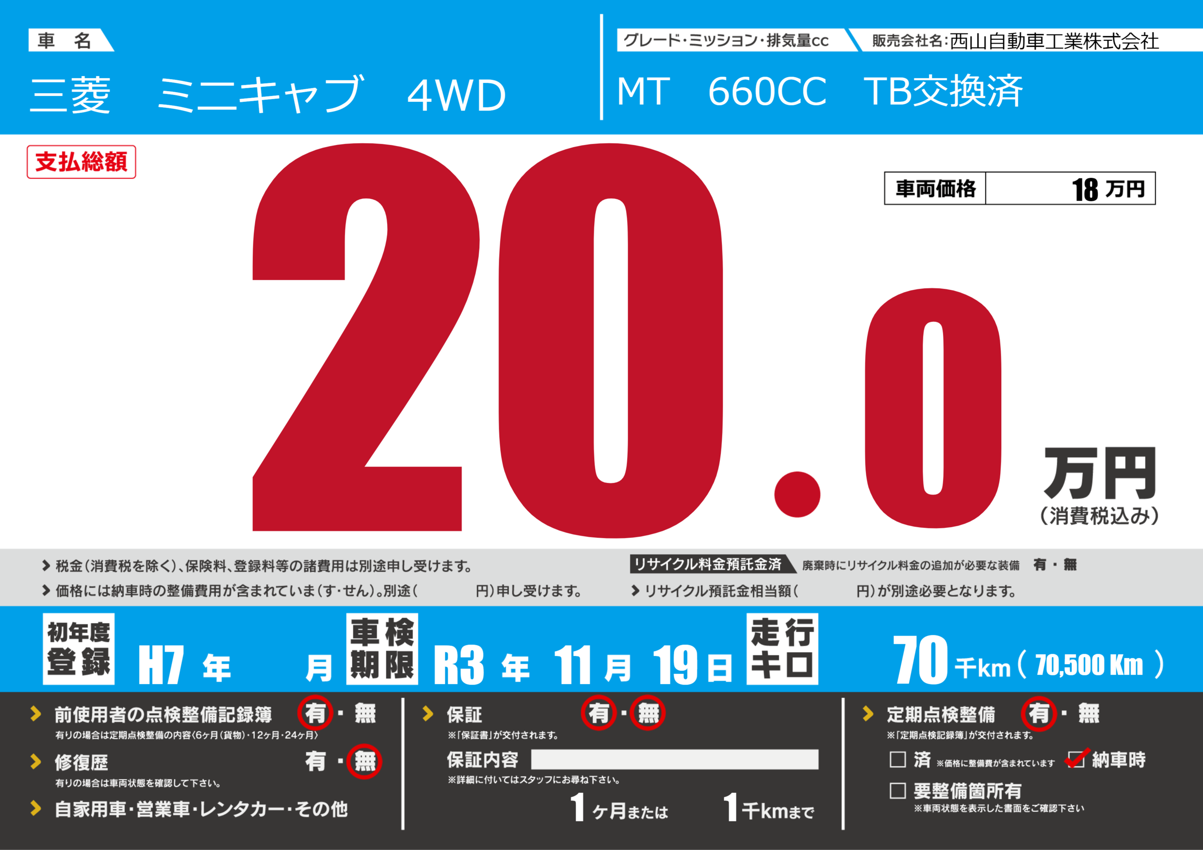 | 定期点検整備 | 定期点検整備あり 納車時あり | ||