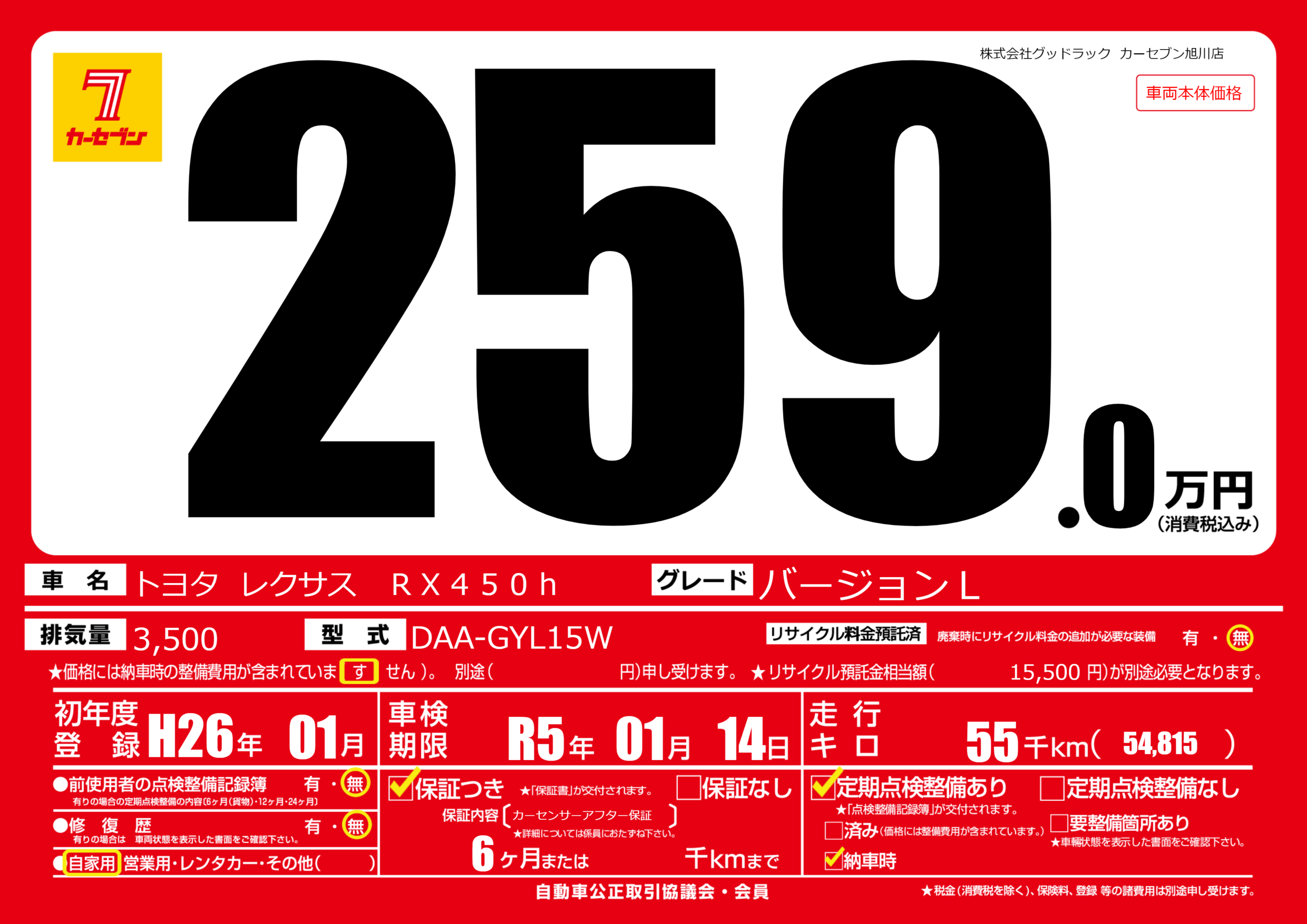 | 車名 | トヨタ レクサス RX450h | グレード ミッション 排気量 |
