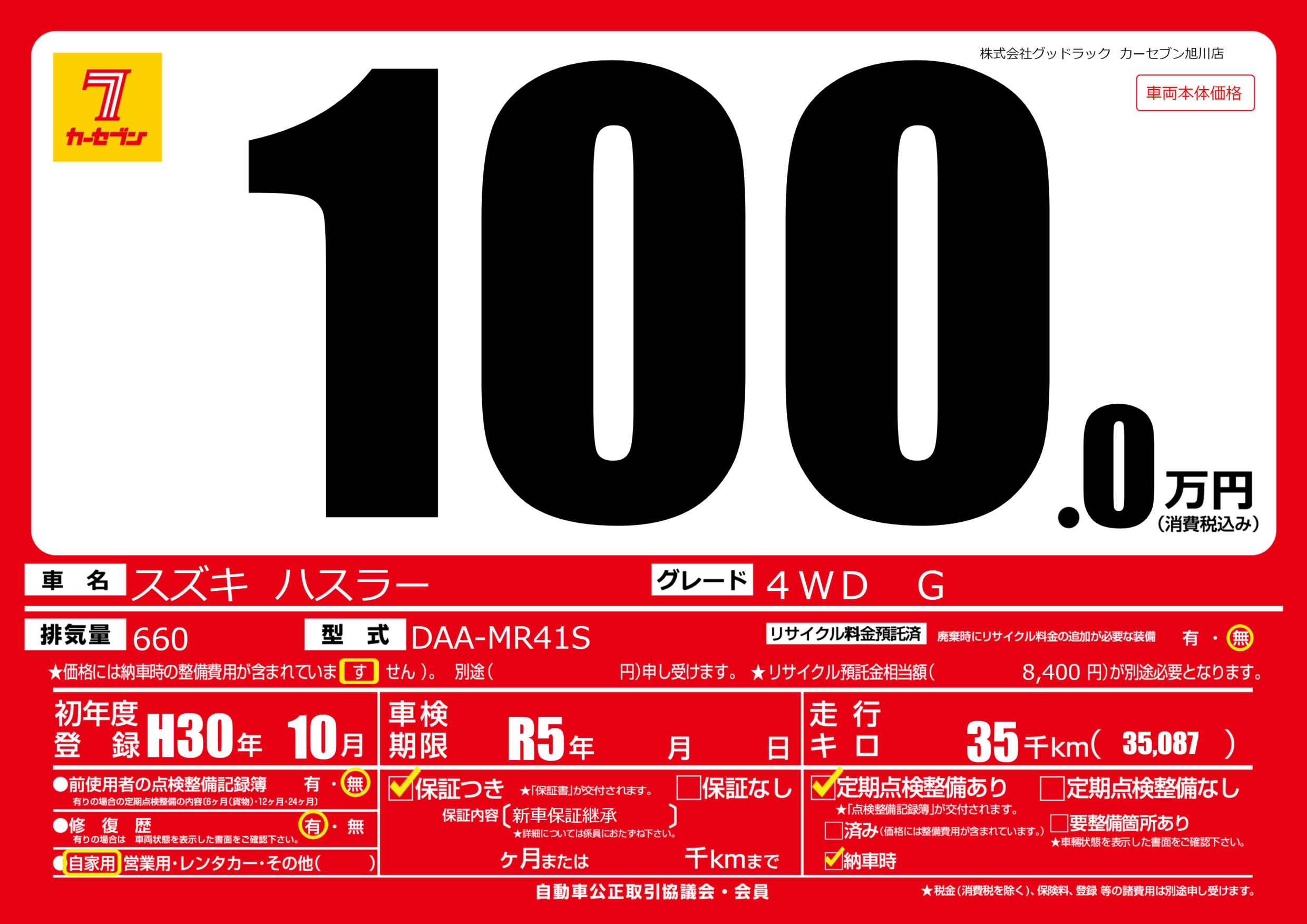 | 走行キロ | 3.5万km | 初年度登録 | H30年10月 |