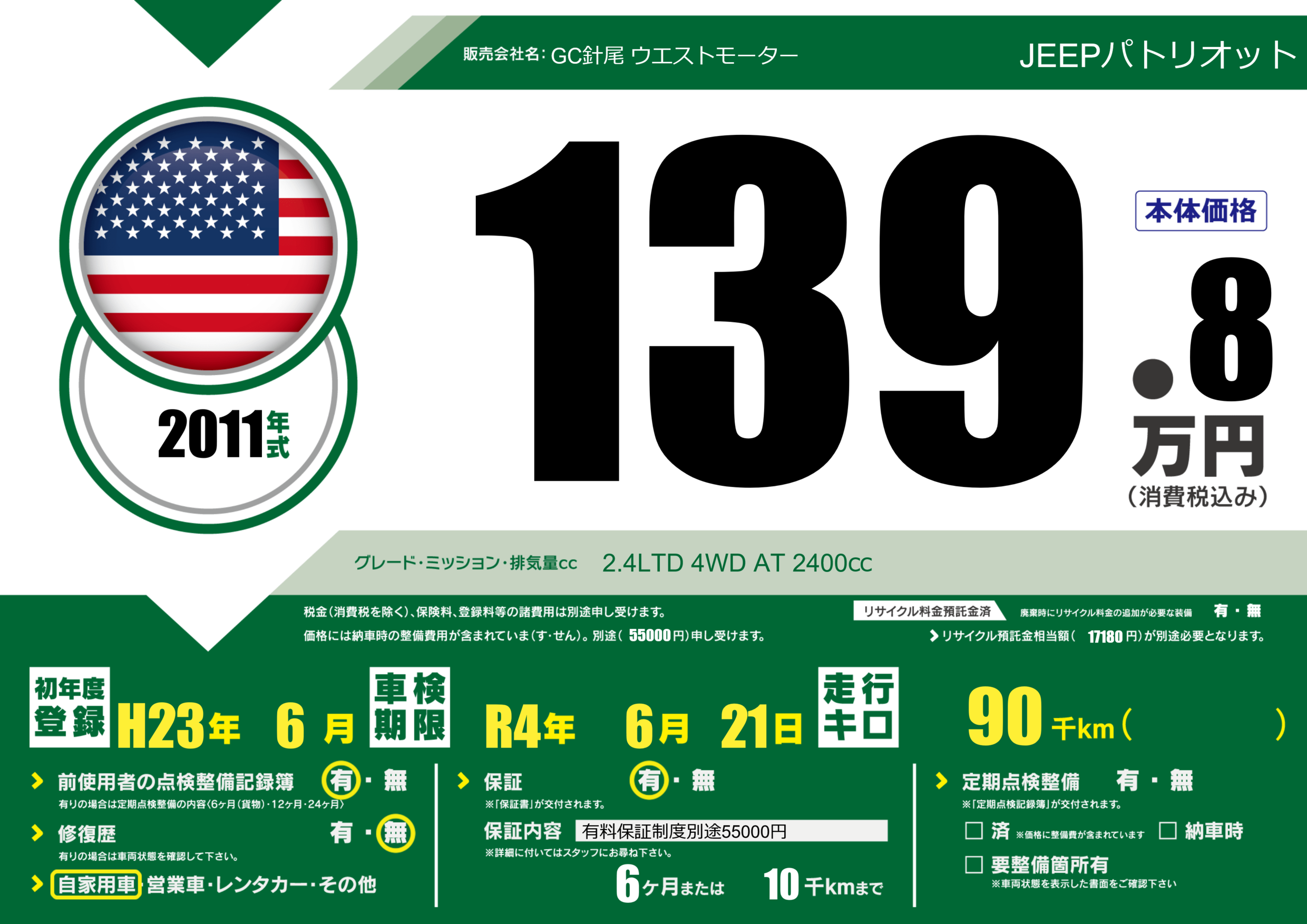 | 走行キロ | 9万km | 初年度登録 | H23年6月 |