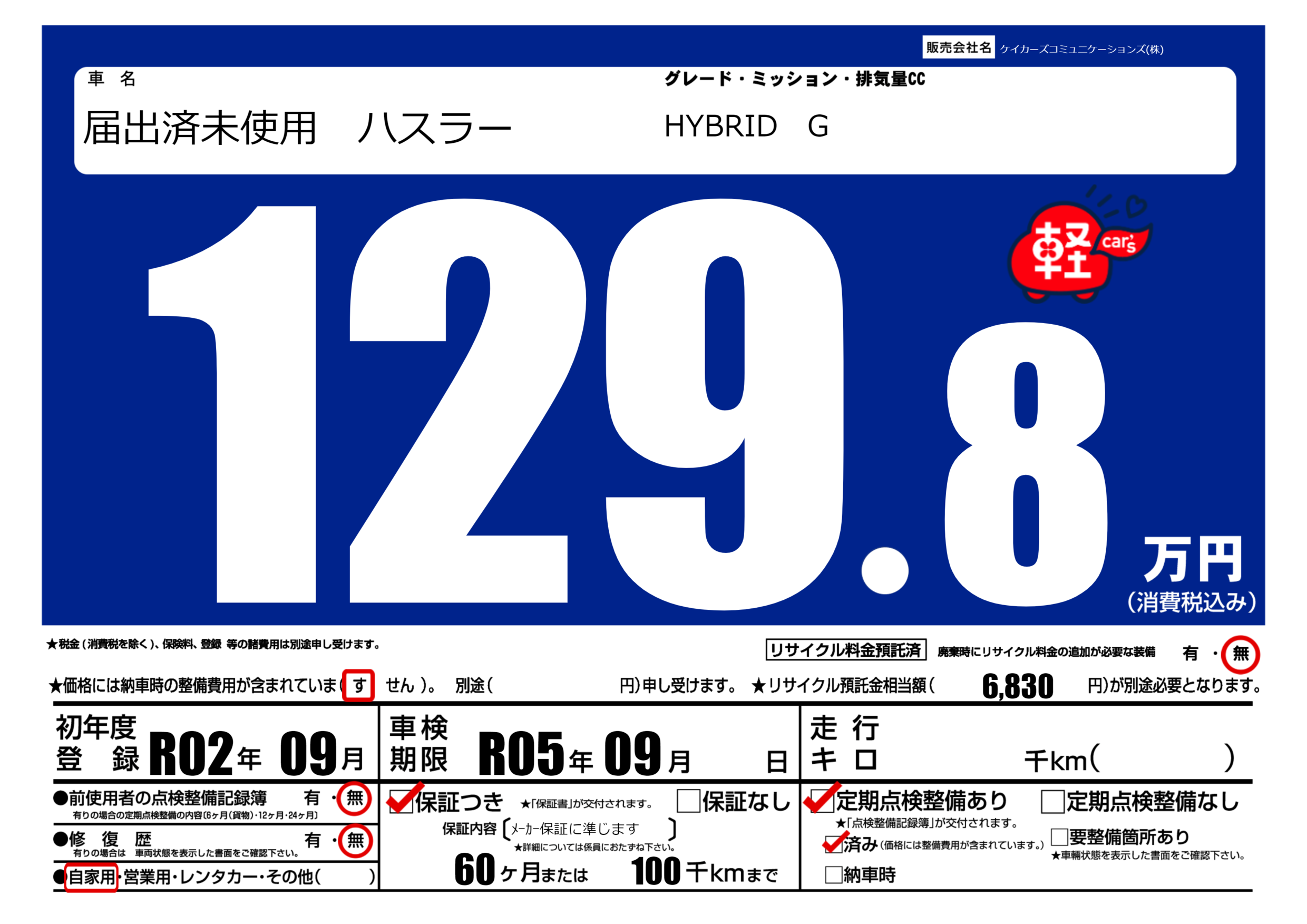 | 車名 | 届出済未使用 ハスラー | グレード ミッション 排気量 |