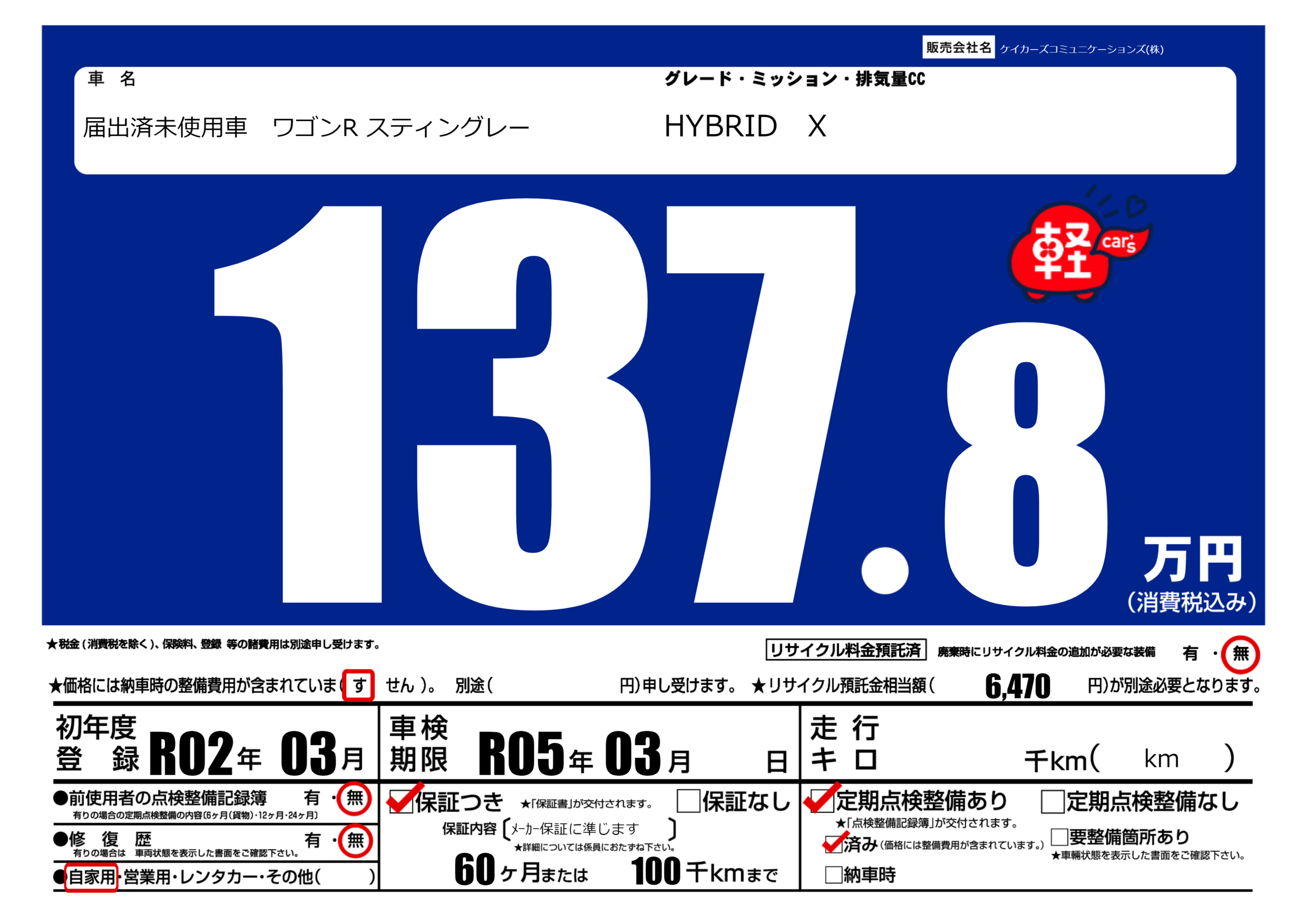 | 定期点検整備 | 定期点検整備あり 定期点検整備済み | ||